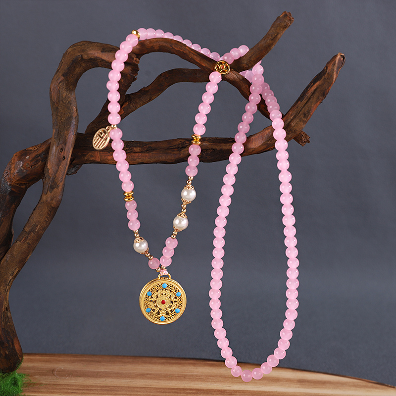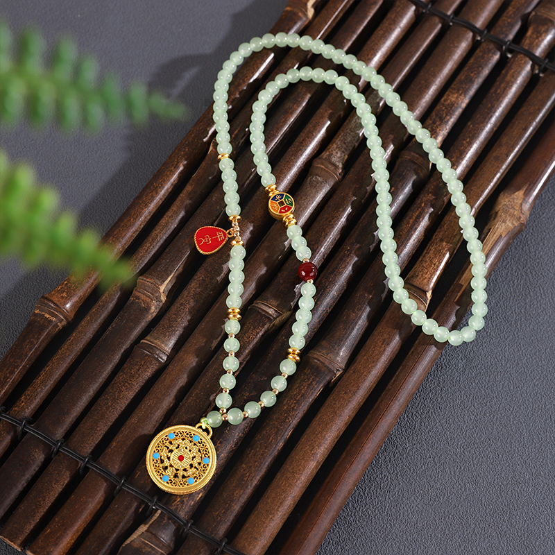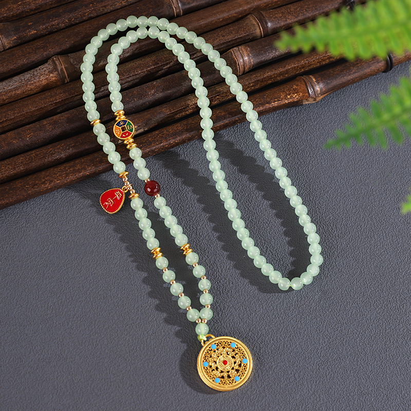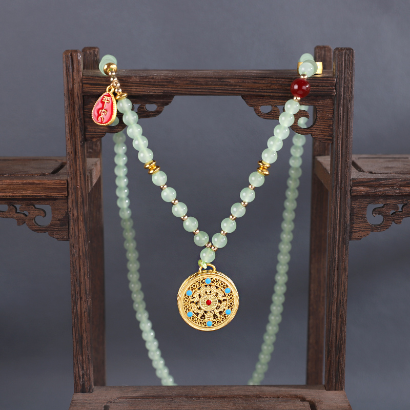 新中式清冷感淡雅绿色串珠项链女圆牌吊坠长款毛衣链复古汉服配饰