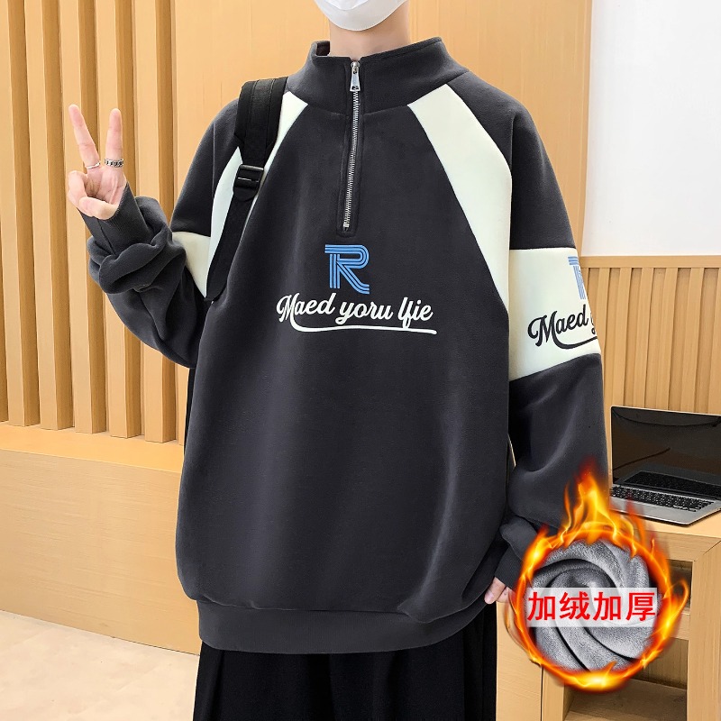 秋冬季半拉链卫衣男初中高中学生加绒加厚青少年大童男装保暖外套