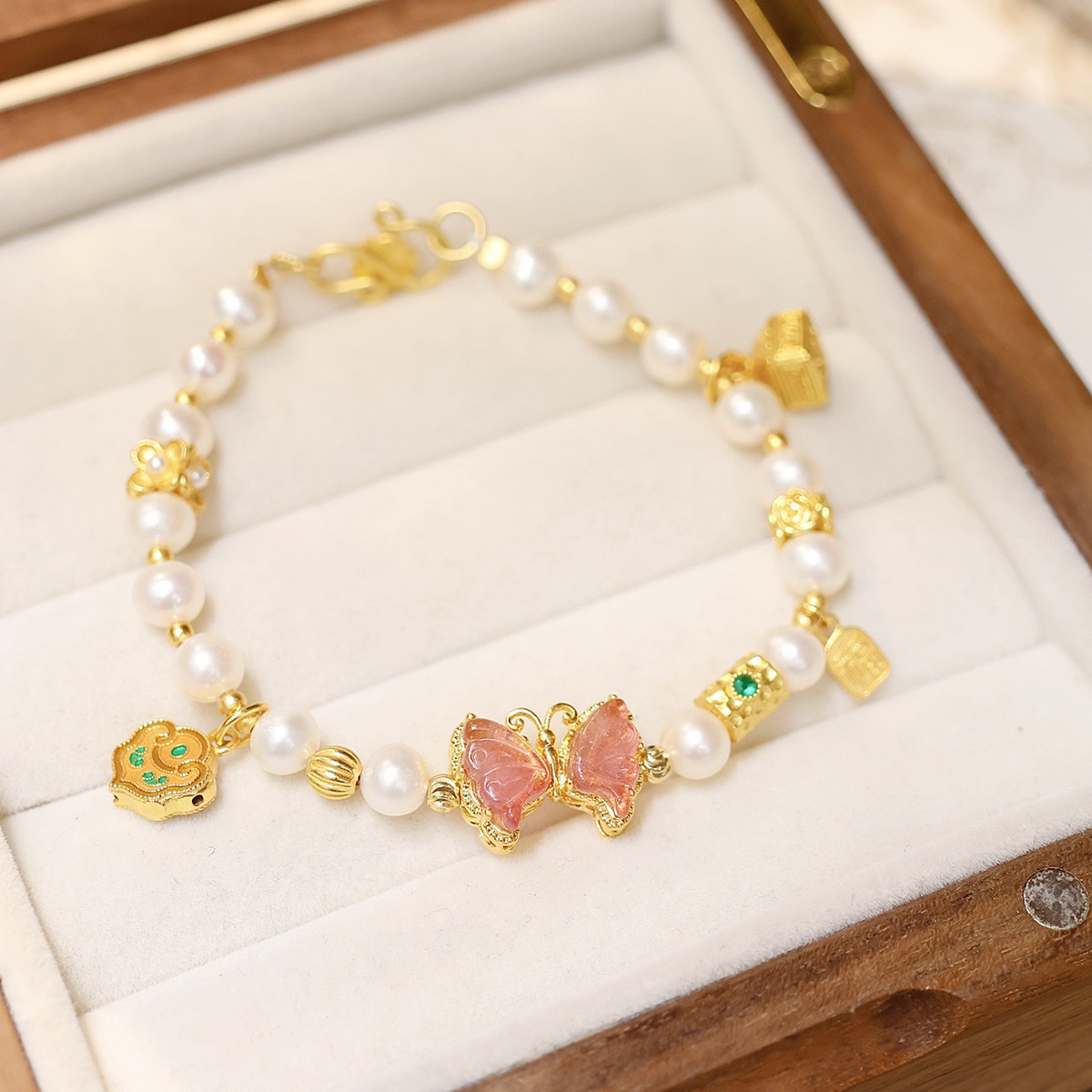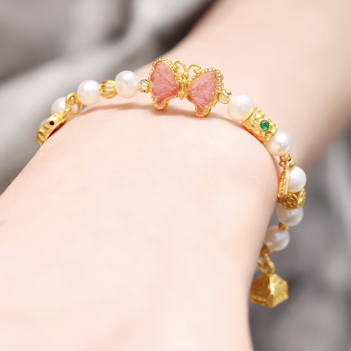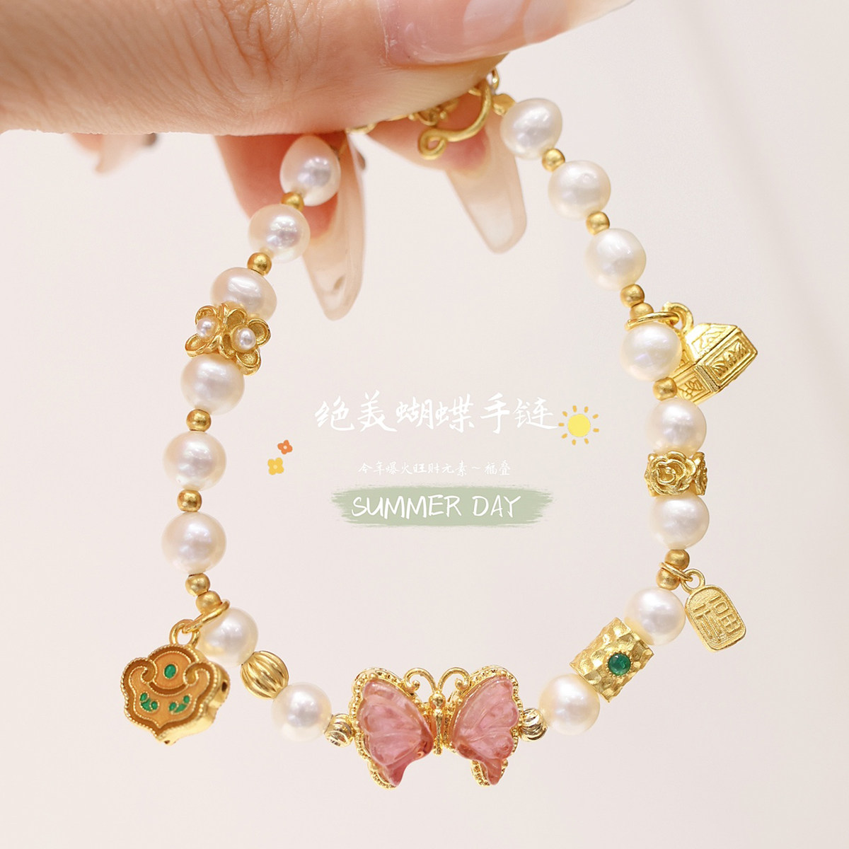 吉盟珠宝18K金碧玺蝴蝶手链珍珠古法银手串送女友礼物甜美新中式