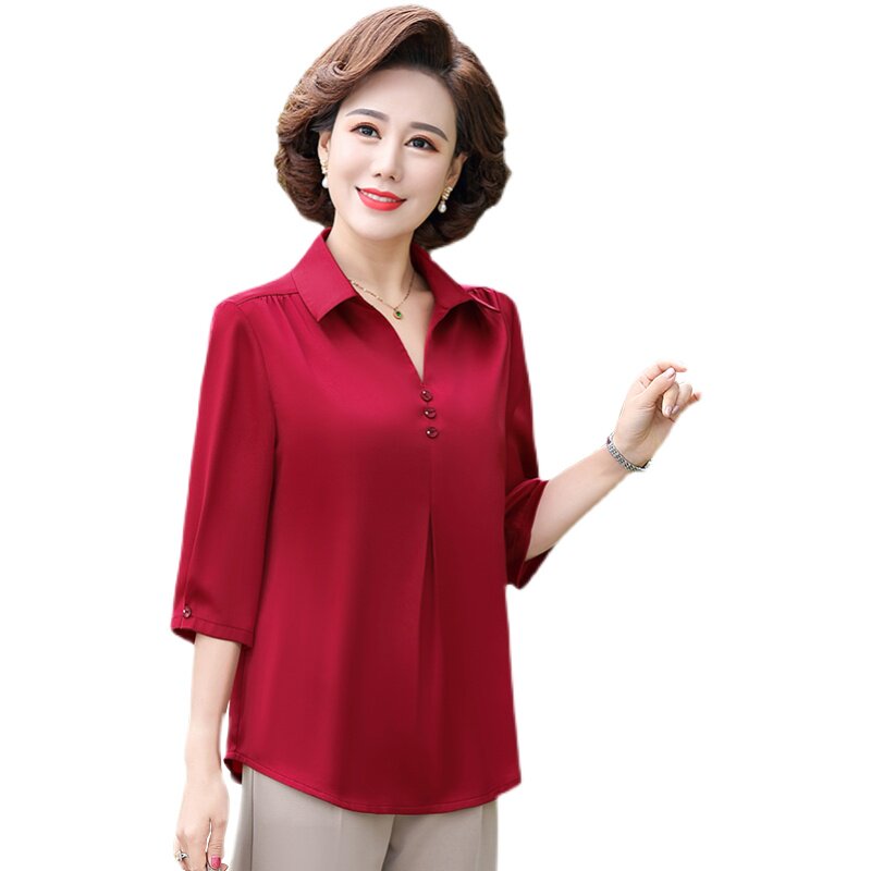 中老年人七分袖真丝衬衫女加肥加大码洋气妈妈夏季桑蚕丝T恤套装