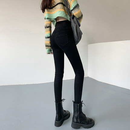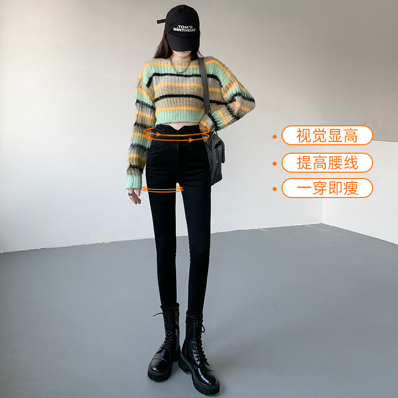 佩艳小脚裤牛仔裤女长裤黑色高腰