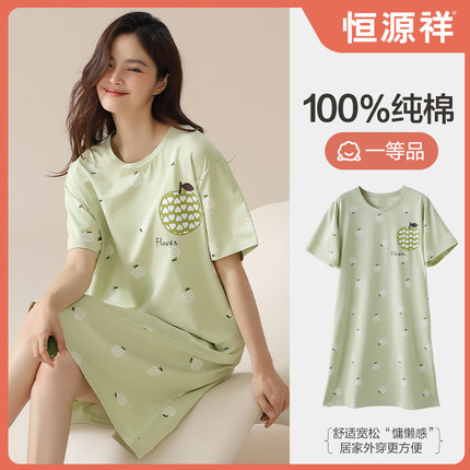 恒源祥纯棉睡裙女士短袖夏季连衣裙全棉薄款宽松睡衣家居服可外穿