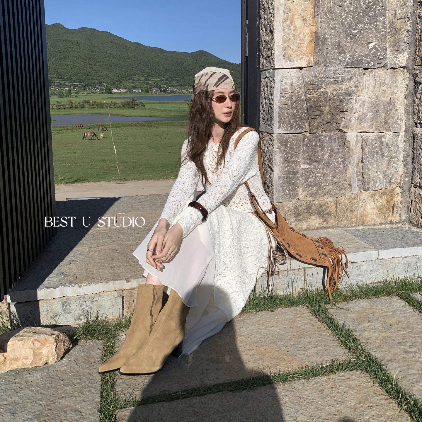 TCCW设计感针织镂空连衣裙女秋季新款Best U百搭显瘦纯色罩衫长裙