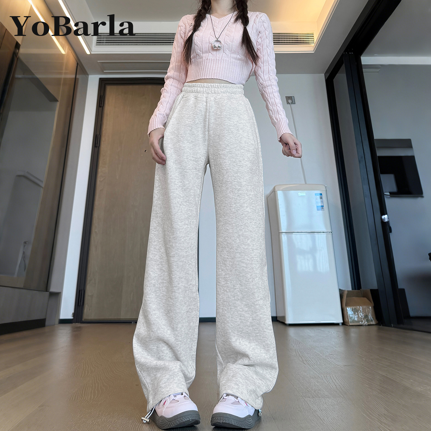 雪花灰运动休闲裤女大码秋冬加绒胖mm宽松直筒垂感显瘦阔腿卫裤子