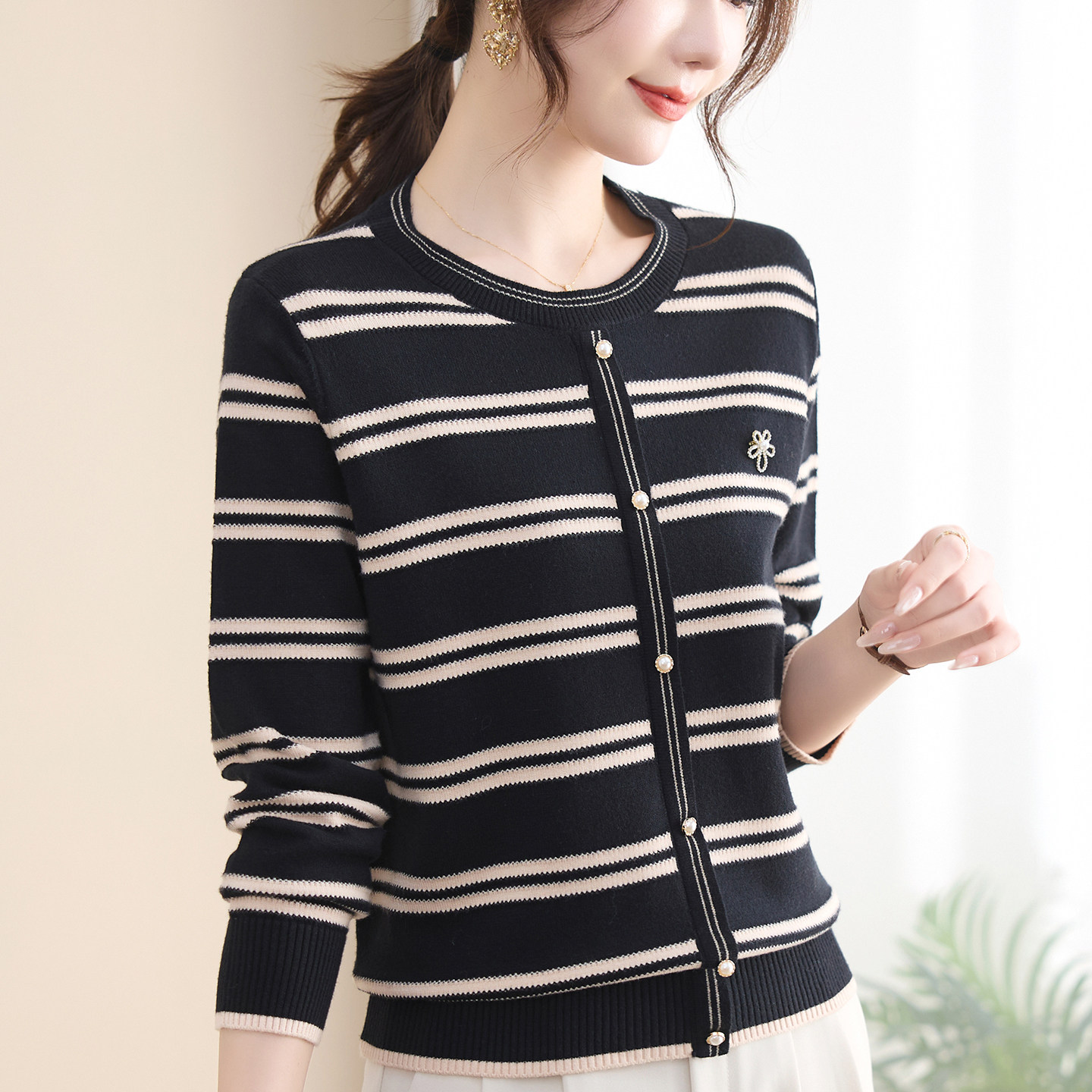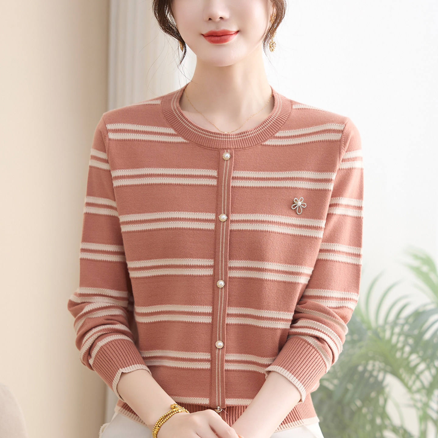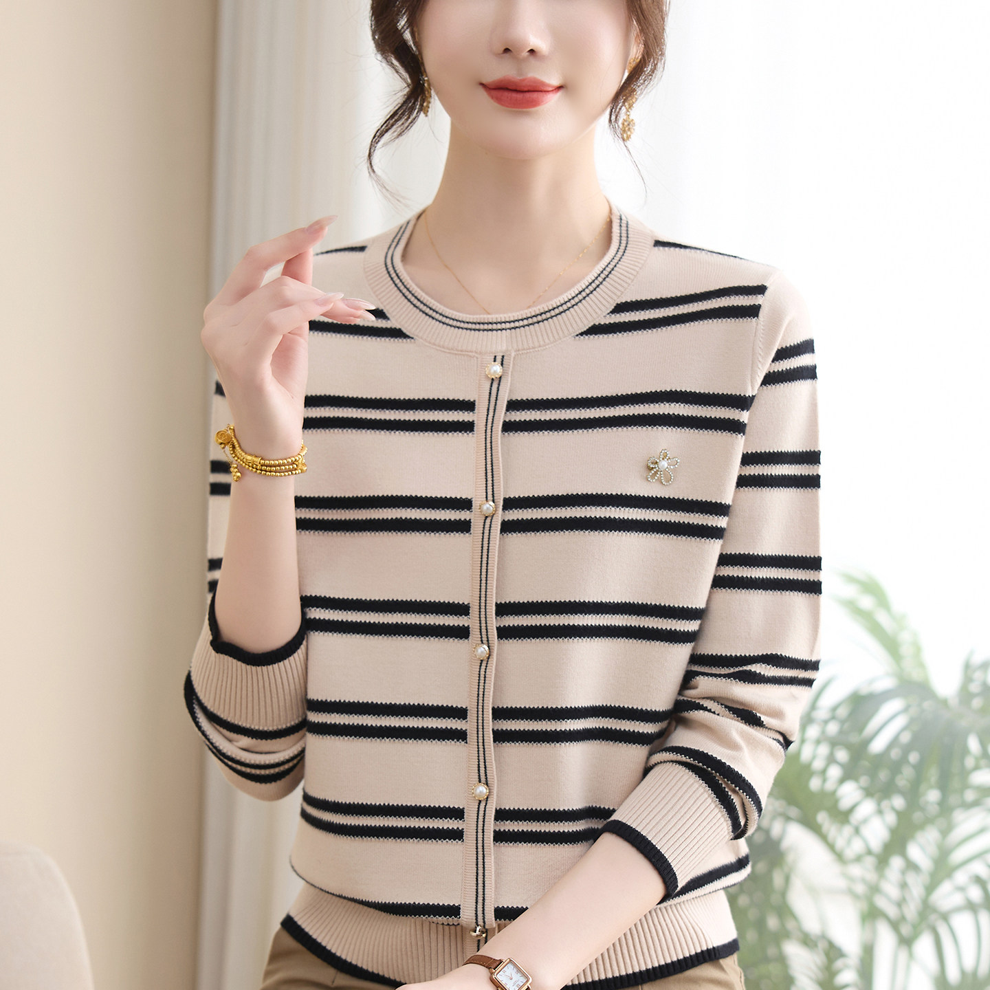 洋气妈妈秋装针织打底衫中年女装新款圆领上衣中老年春秋条纹小衫