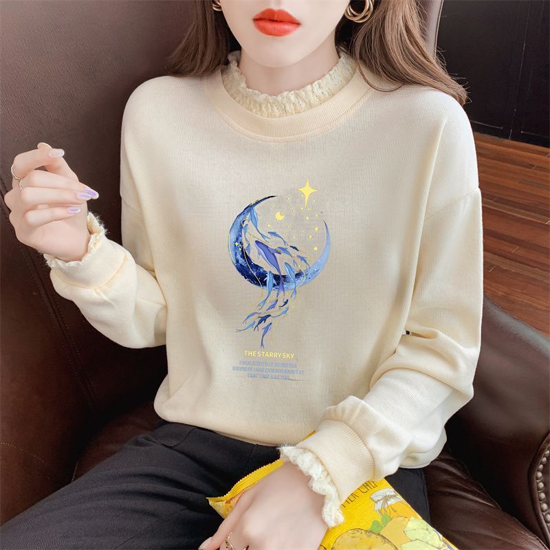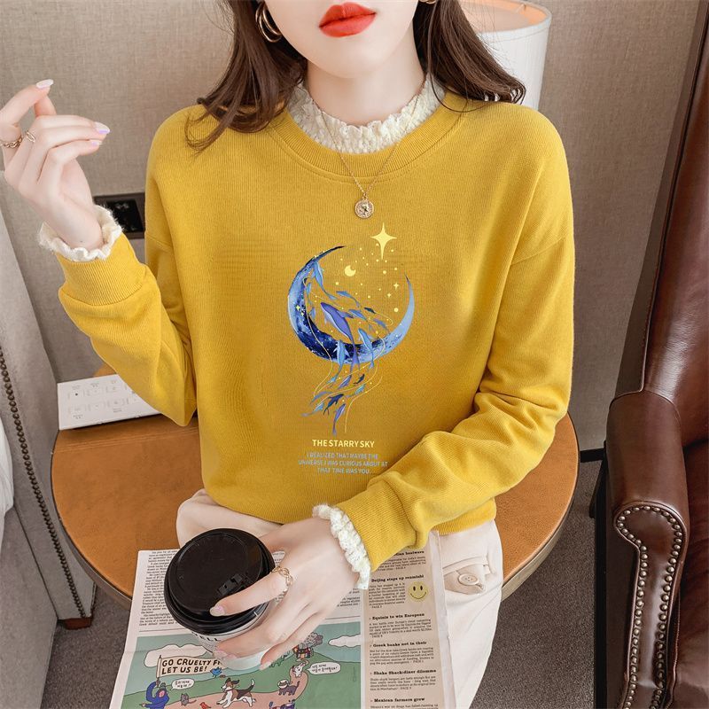 圆领卫衣女时尚蕾丝拼接假两件长袖t恤女冬新款韩版印花宽松上衣