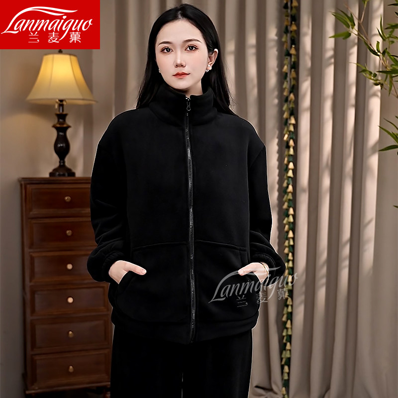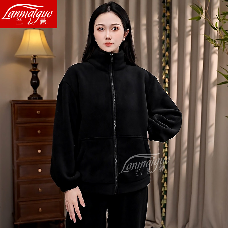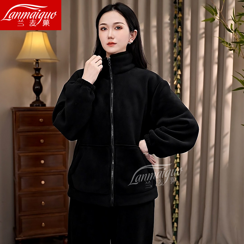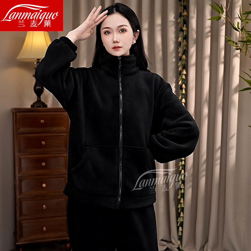 冬季新款睡衣女海豚绒纯色时尚休闲加厚保暖拉链家居服套装外穿