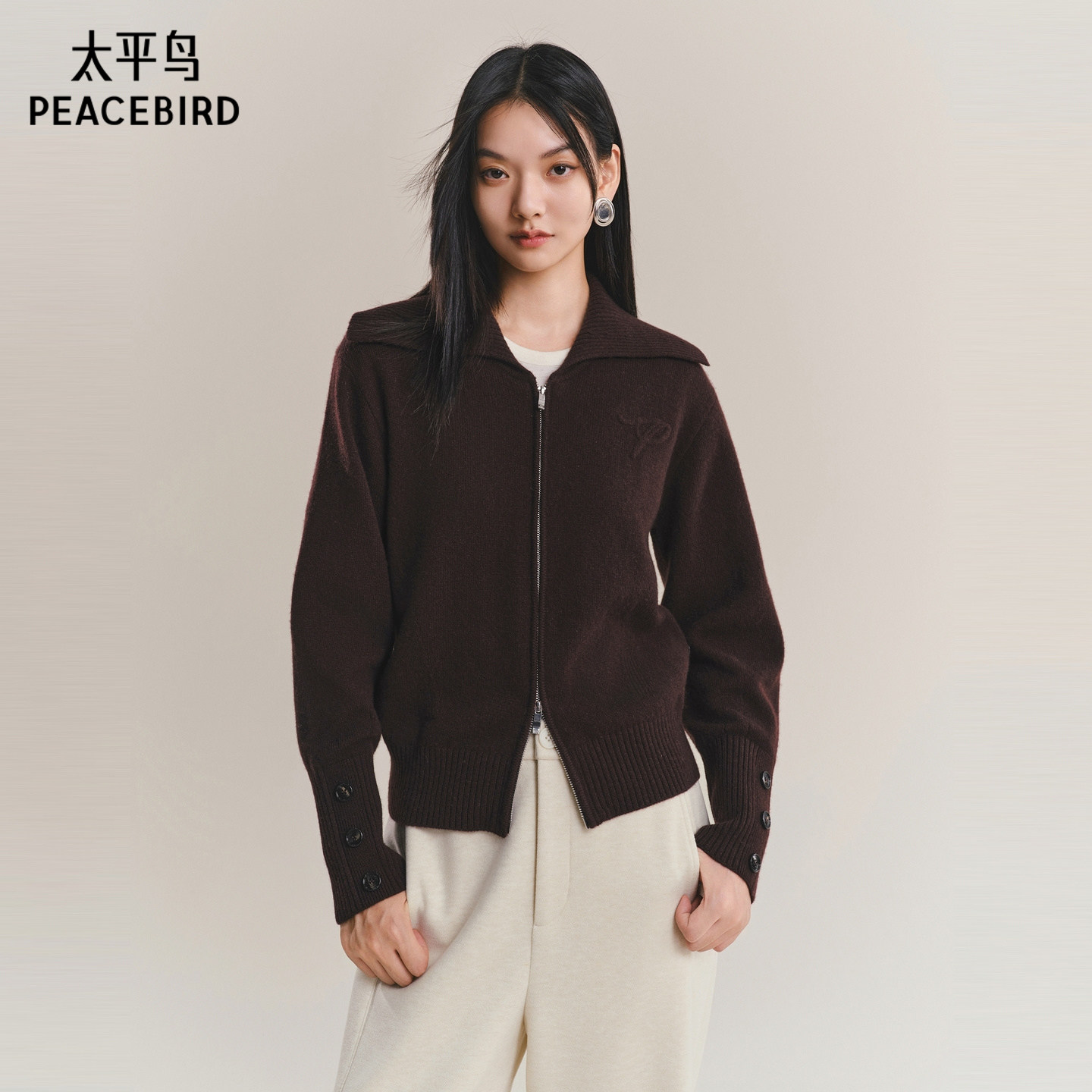 【商场同款】太平鸟摩卡100%全羊毛双拉链翻领针织开衫A1EDF4442