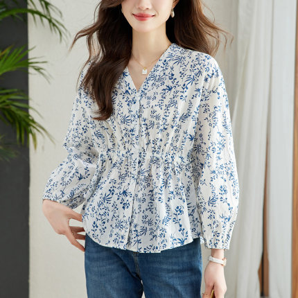 初影青花瓷新中式衬衫女长袖2025秋装新款V领上衣印花纯棉衬衣