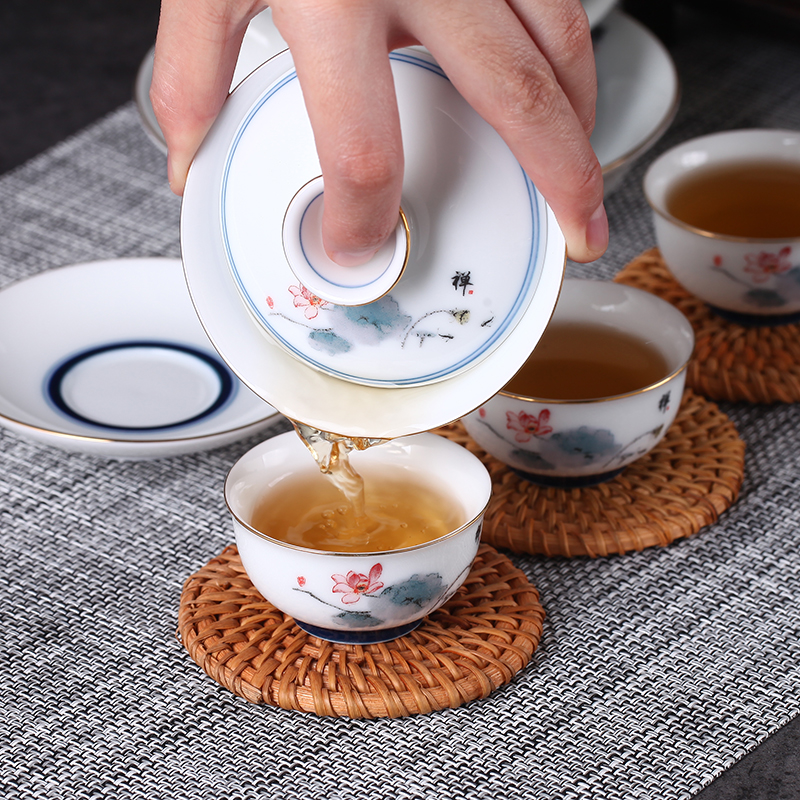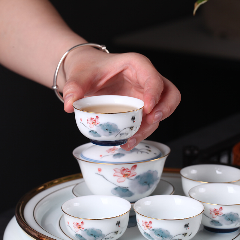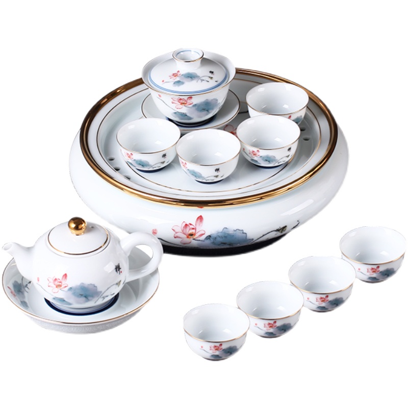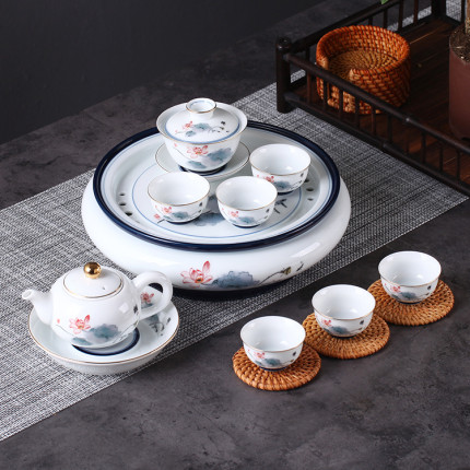 功夫茶具套装高档圆形陶瓷茶盘釉下手绘荷花整套茶具茶杯家用送礼