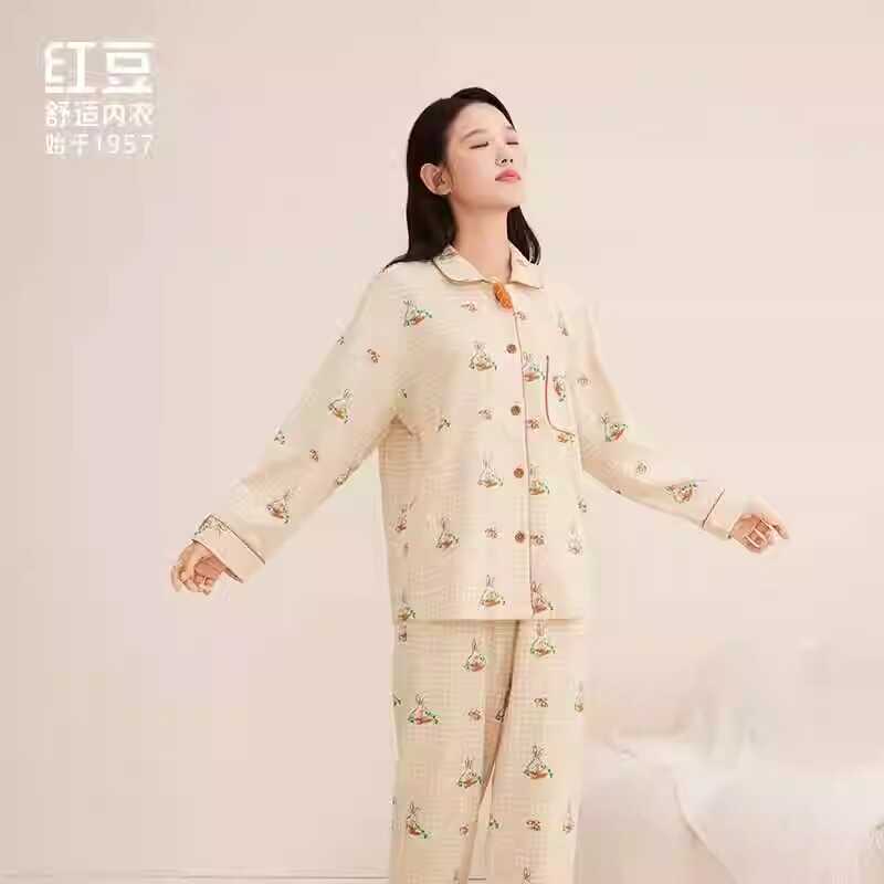 红豆居家秋冬新品纯棉磨毛男女情侣长袖睡衣家居服套装4J519-520