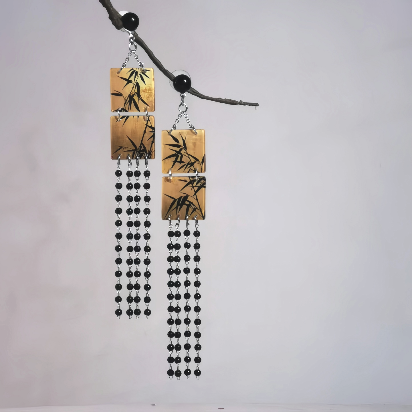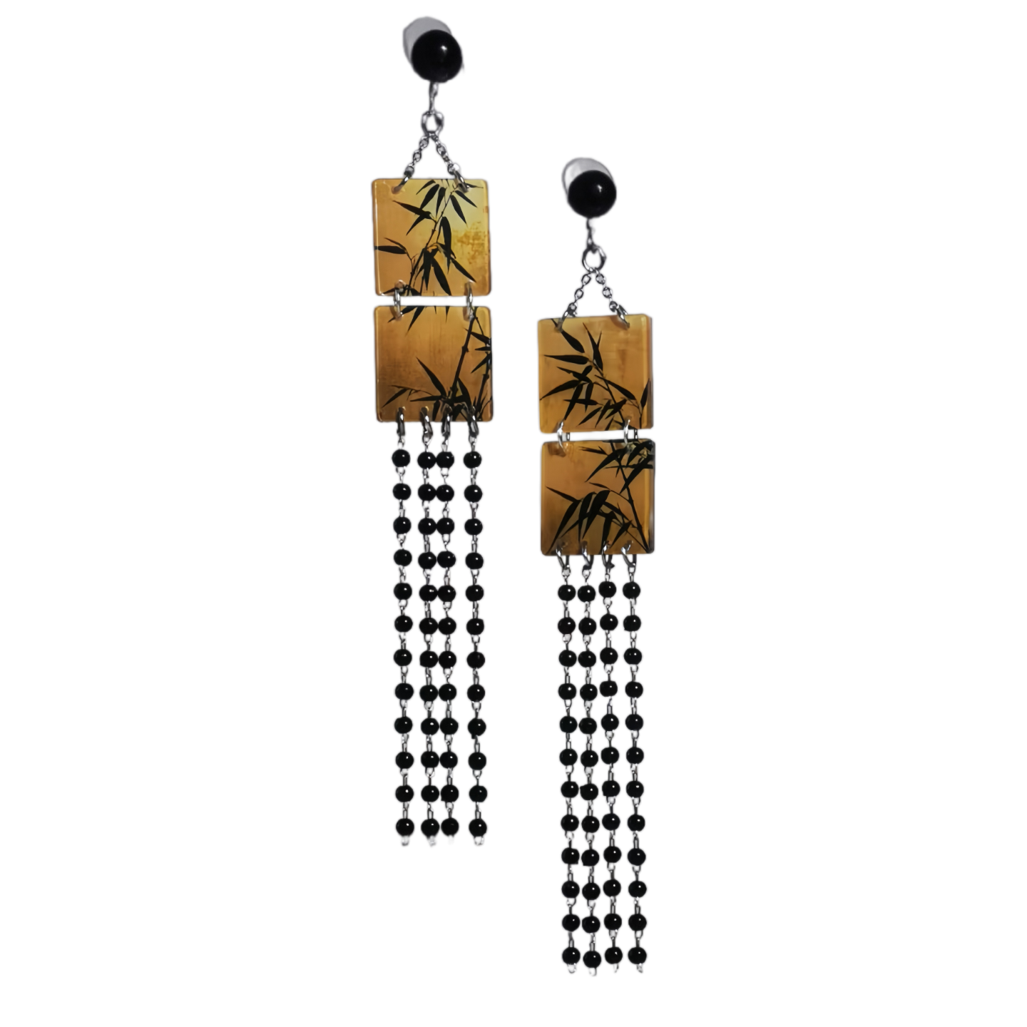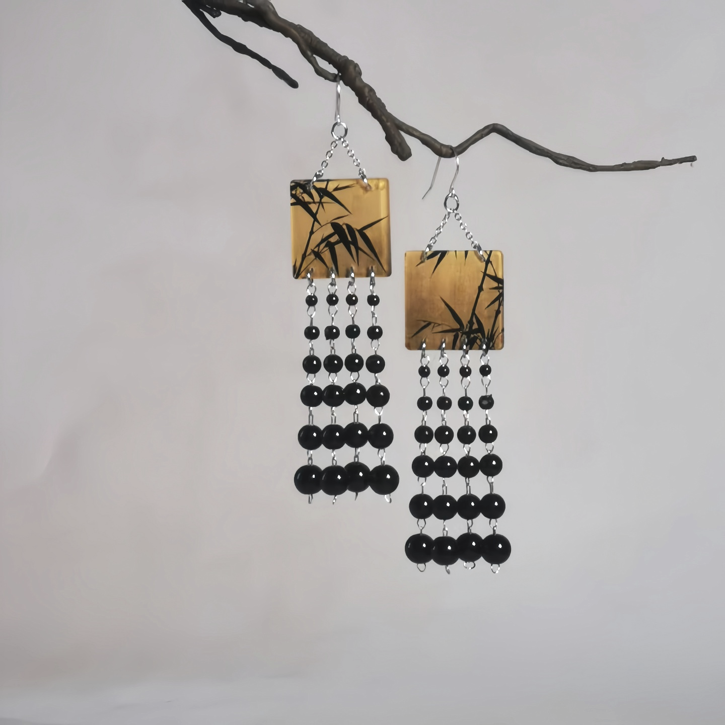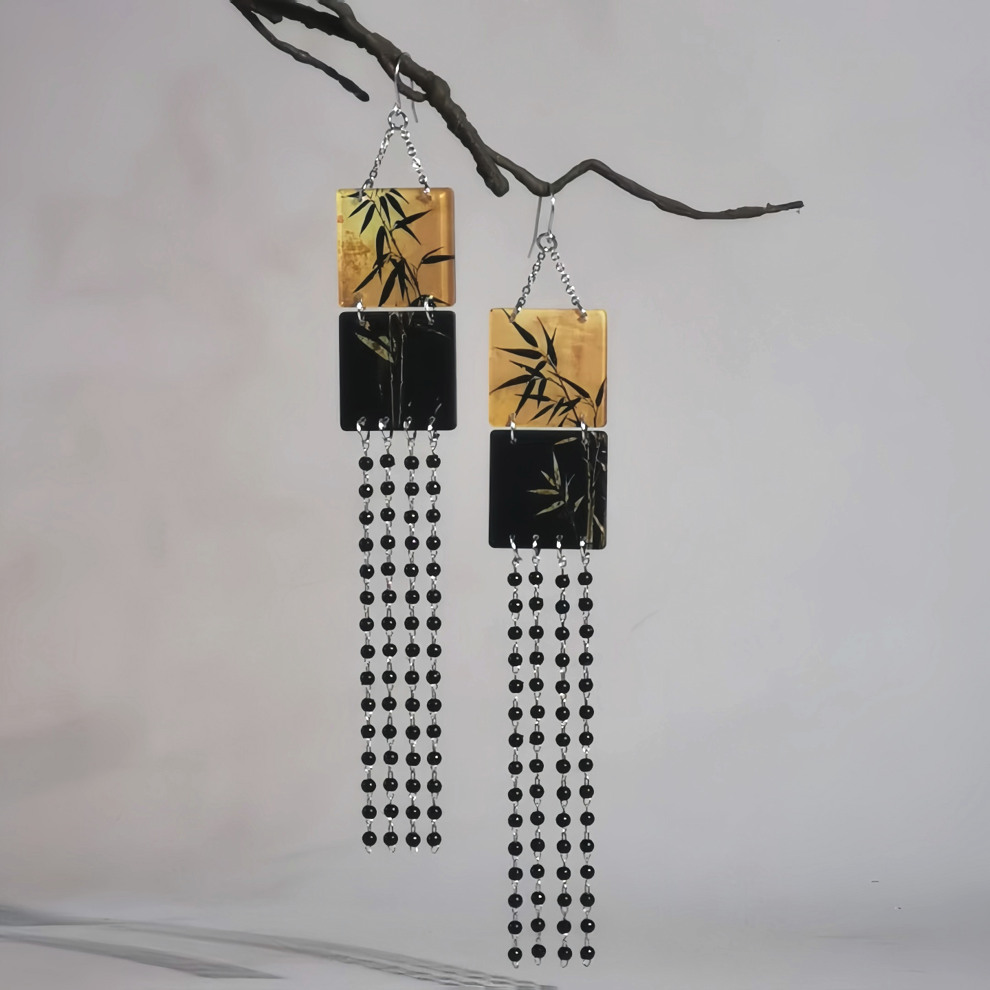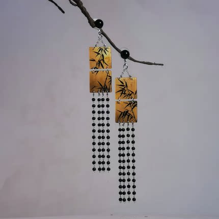 竹叶子耳环长流苏方形仿手绘新中式耳坠原创设计复古国风书法耳饰