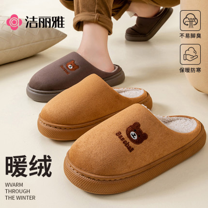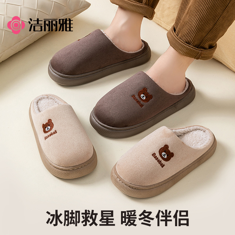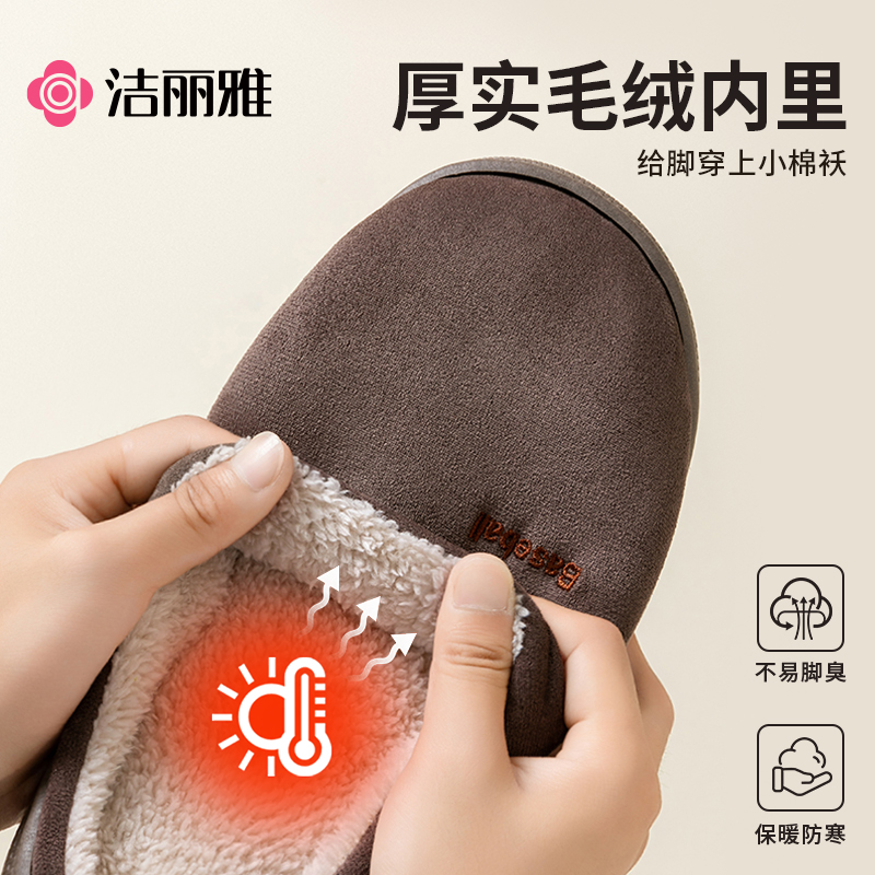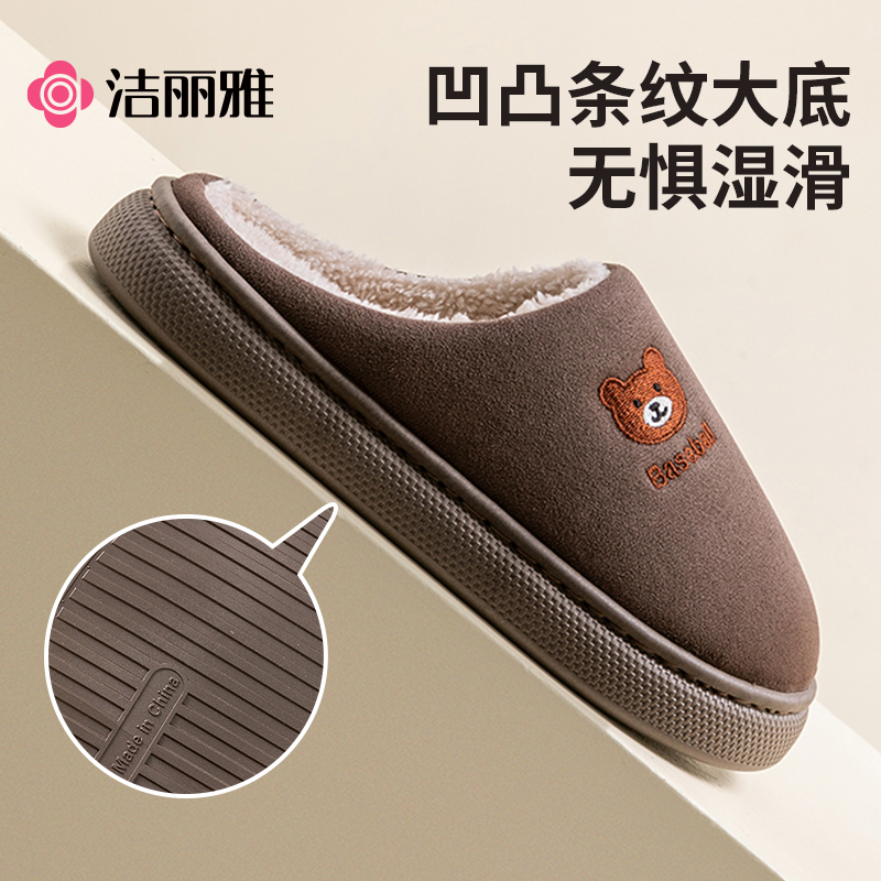 洁丽雅棉拖鞋女款冬季室内外穿居家月子鞋保暖防滑情侣加绒毛拖鞋