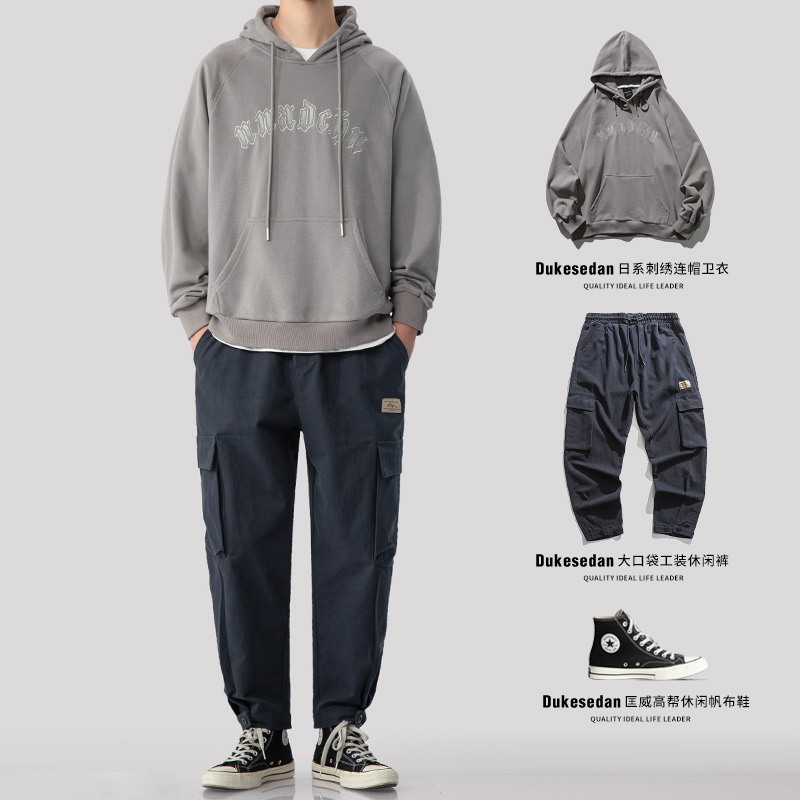 休闲运动套装男春秋季款字母连帽卫衣大码宽松工装裤子男士休闲裤