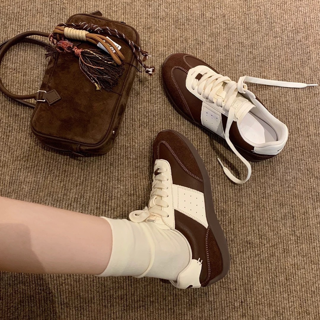 香港2025初秋新款美拉德韩版拼色系带运动休闲鞋板鞋女德训鞋