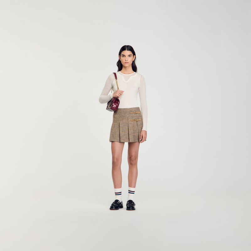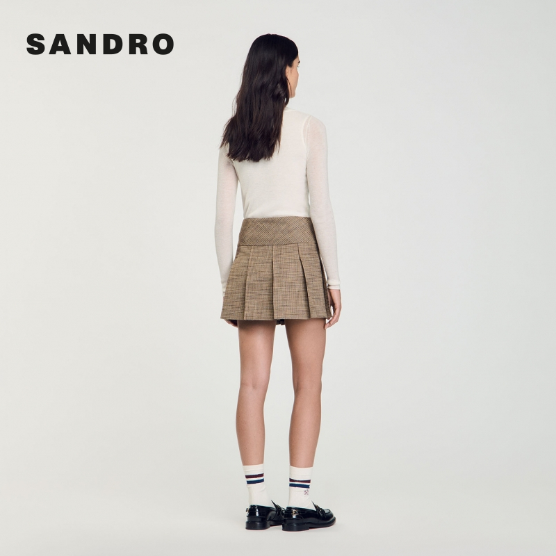 SANDRO Outlets秋冬女装法式简约学院风复古格纹皮扣百褶半身短裙