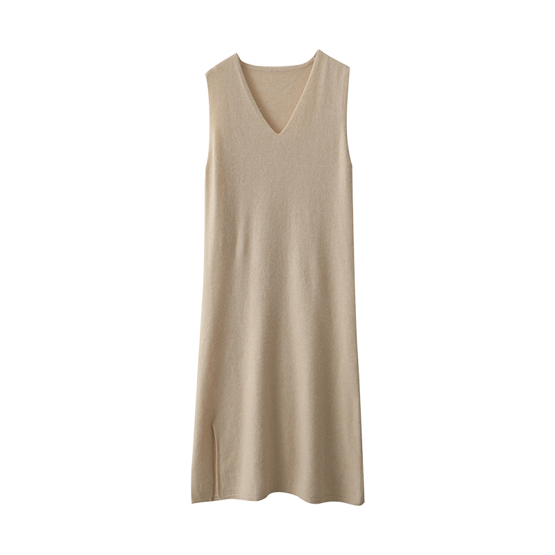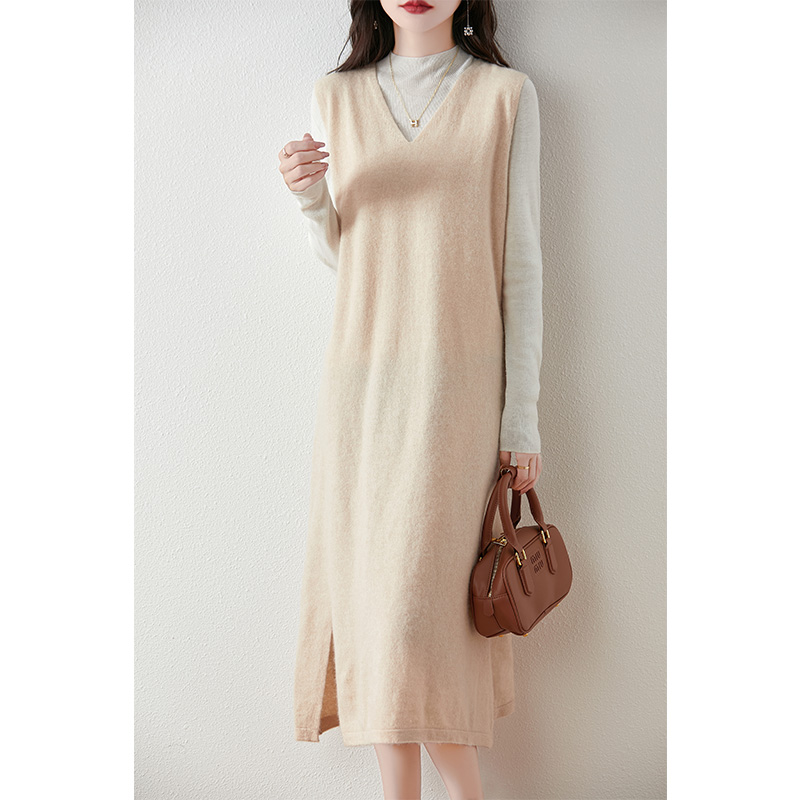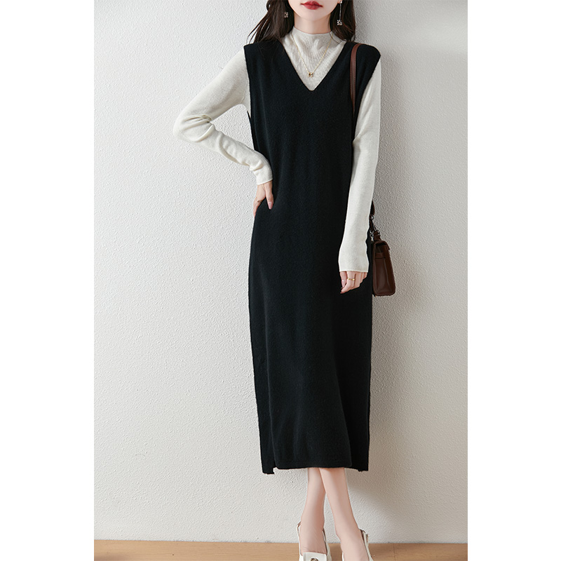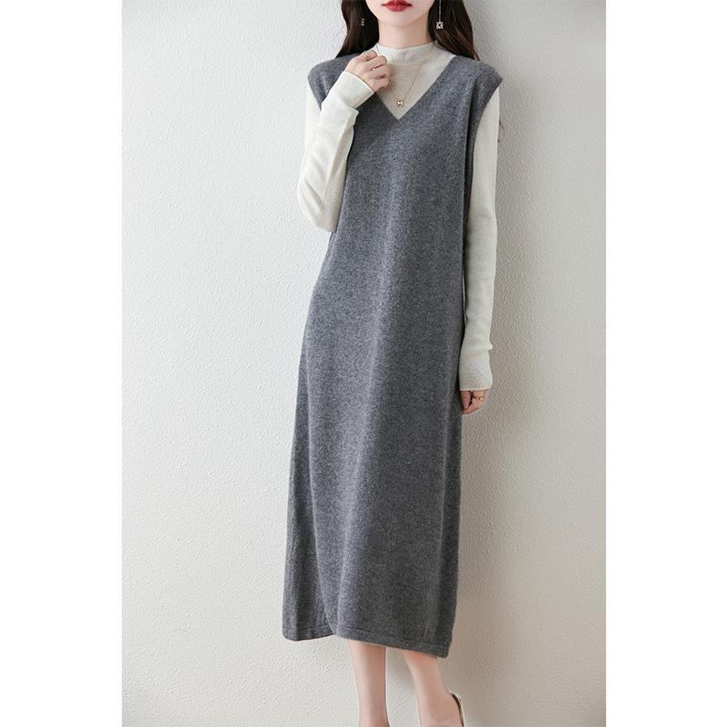 秋冬新款V领羊毛针织马甲裙女士时尚羊绒背心连衣裙无袖打底长裙