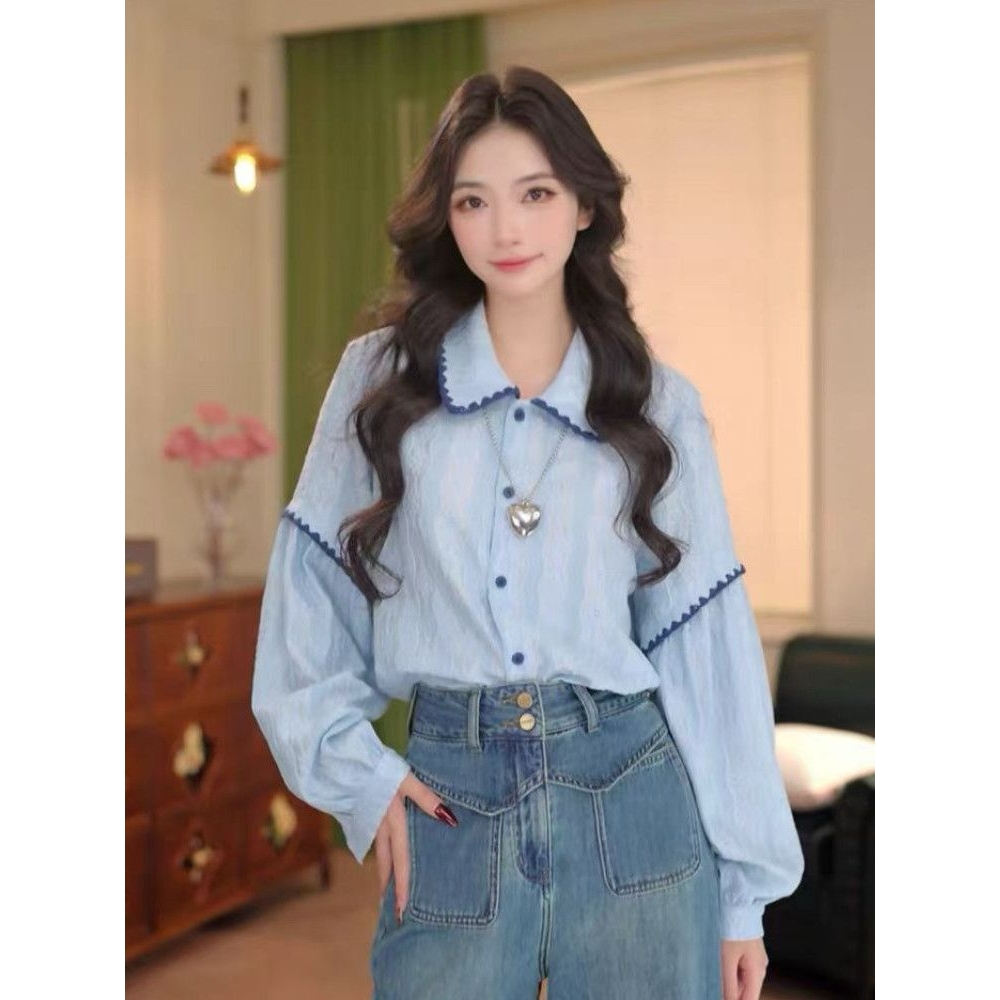 港风撞色拼接衬衫女秋季新款肌理感文艺复古宽松百搭长袖漂亮上衣