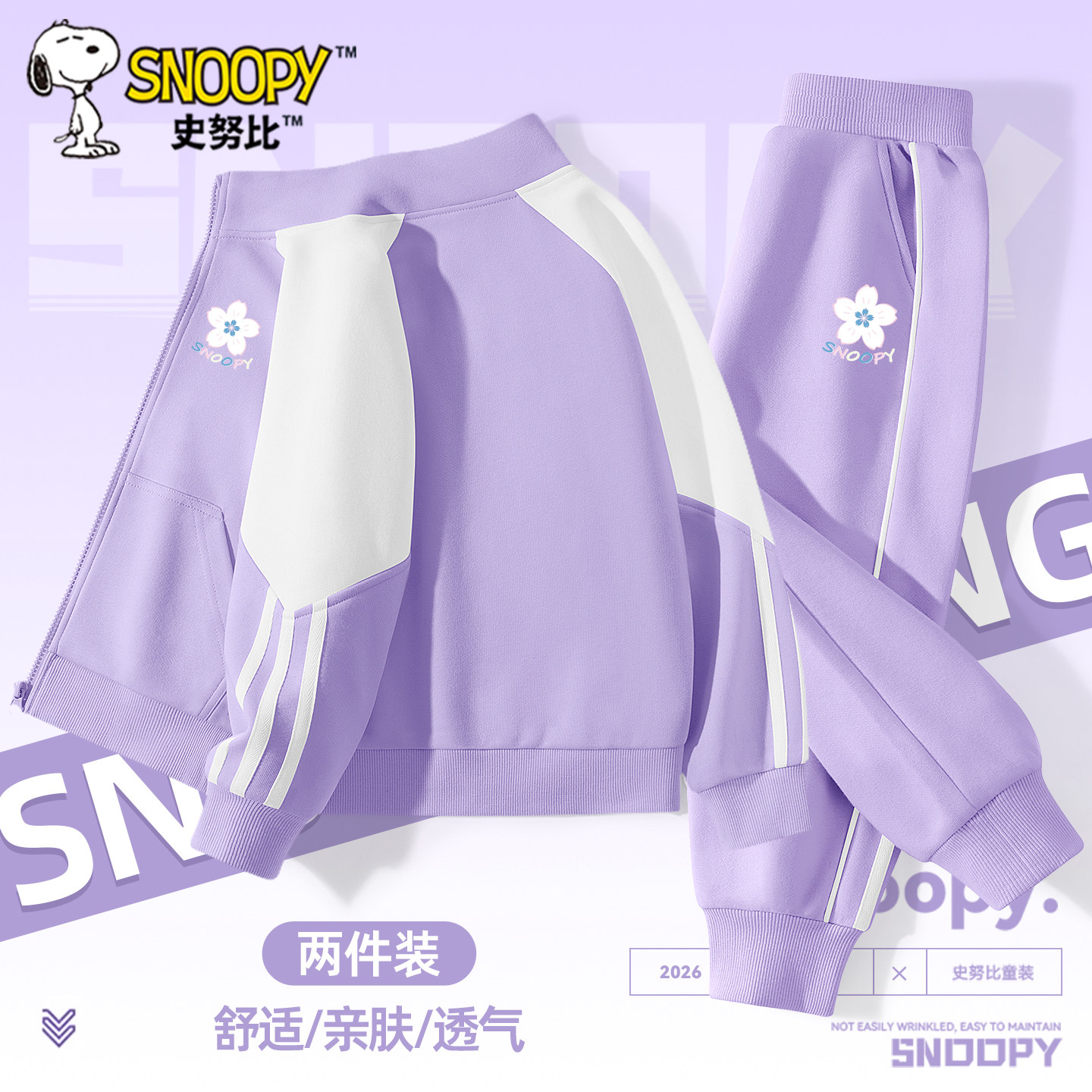 史努比女童春装套装2026新款女孩紫色外套时尚上衣儿童运动服春秋