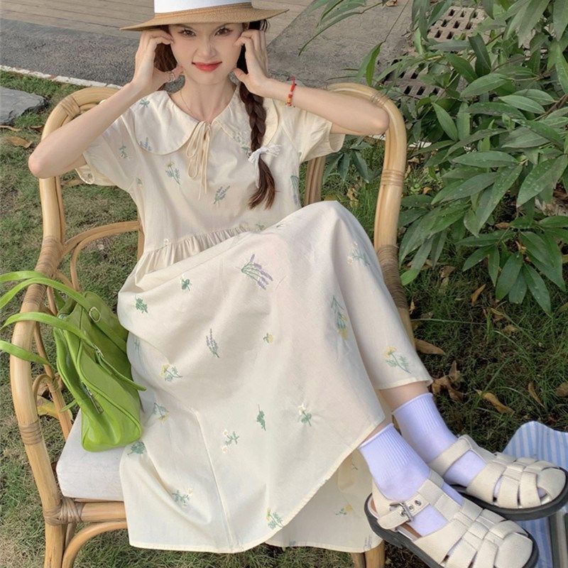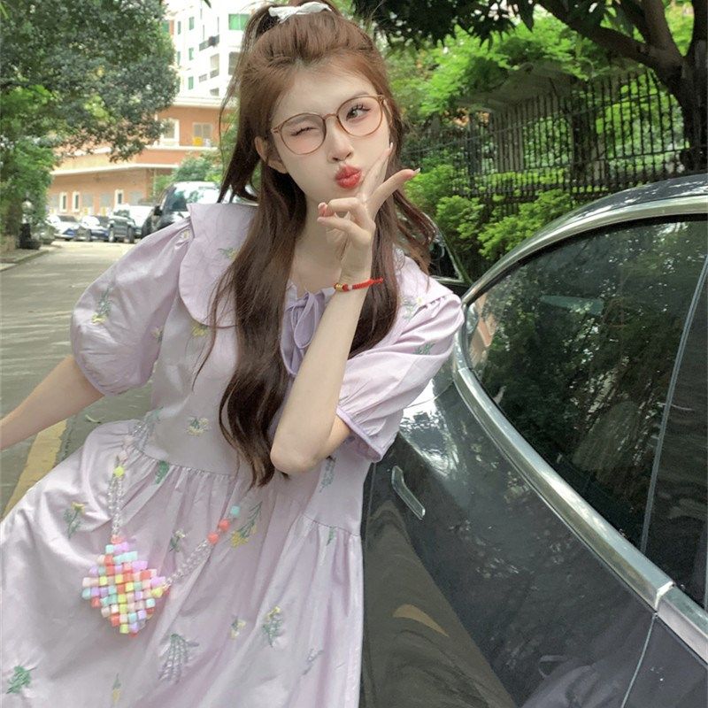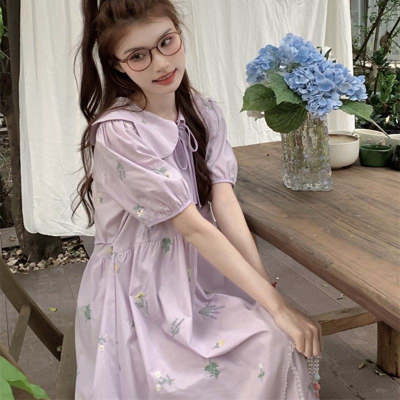 女大童短袖连衣裙夏季p少女孩初中高中学生胖童宽松刺绣碎花长裙