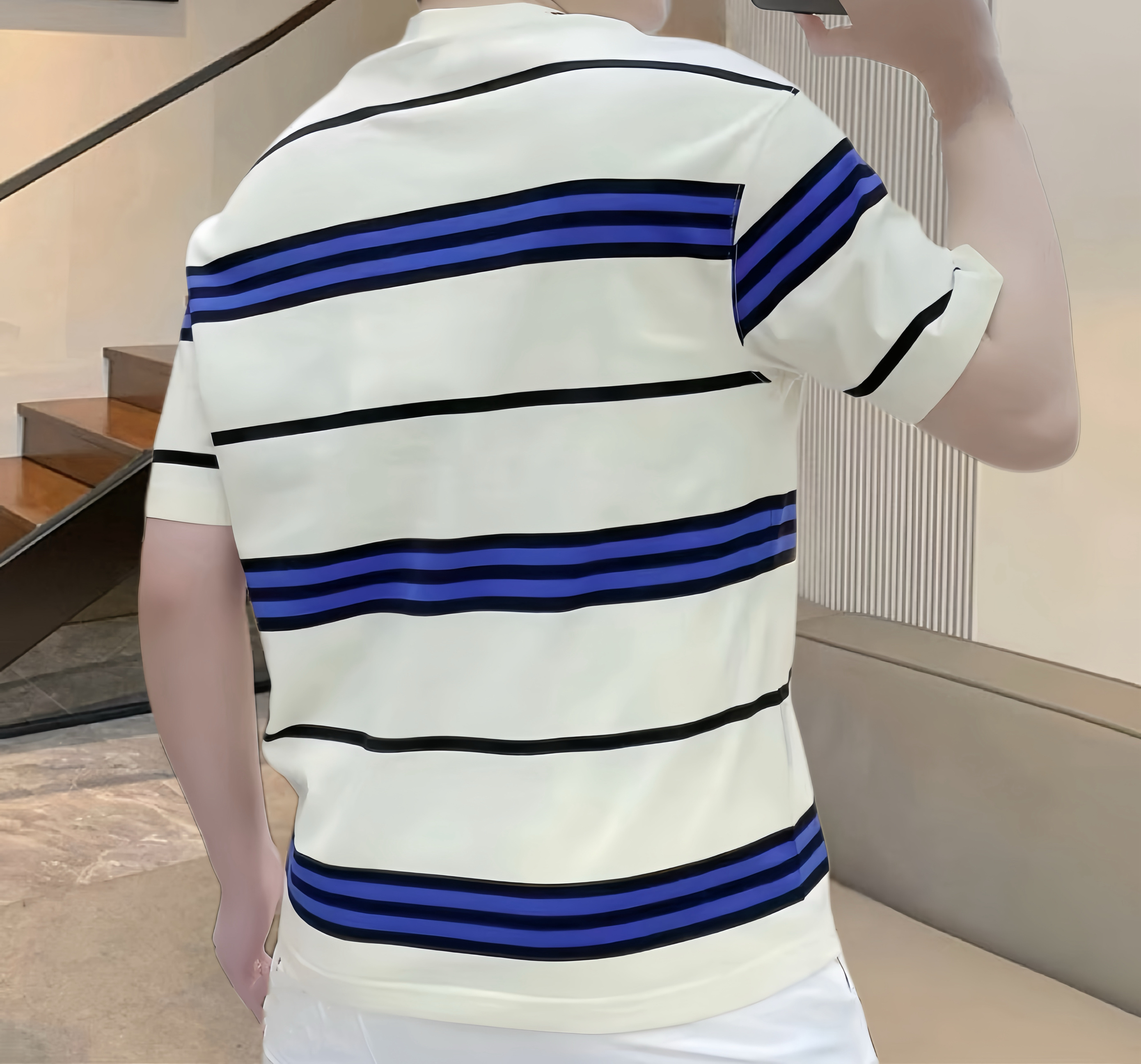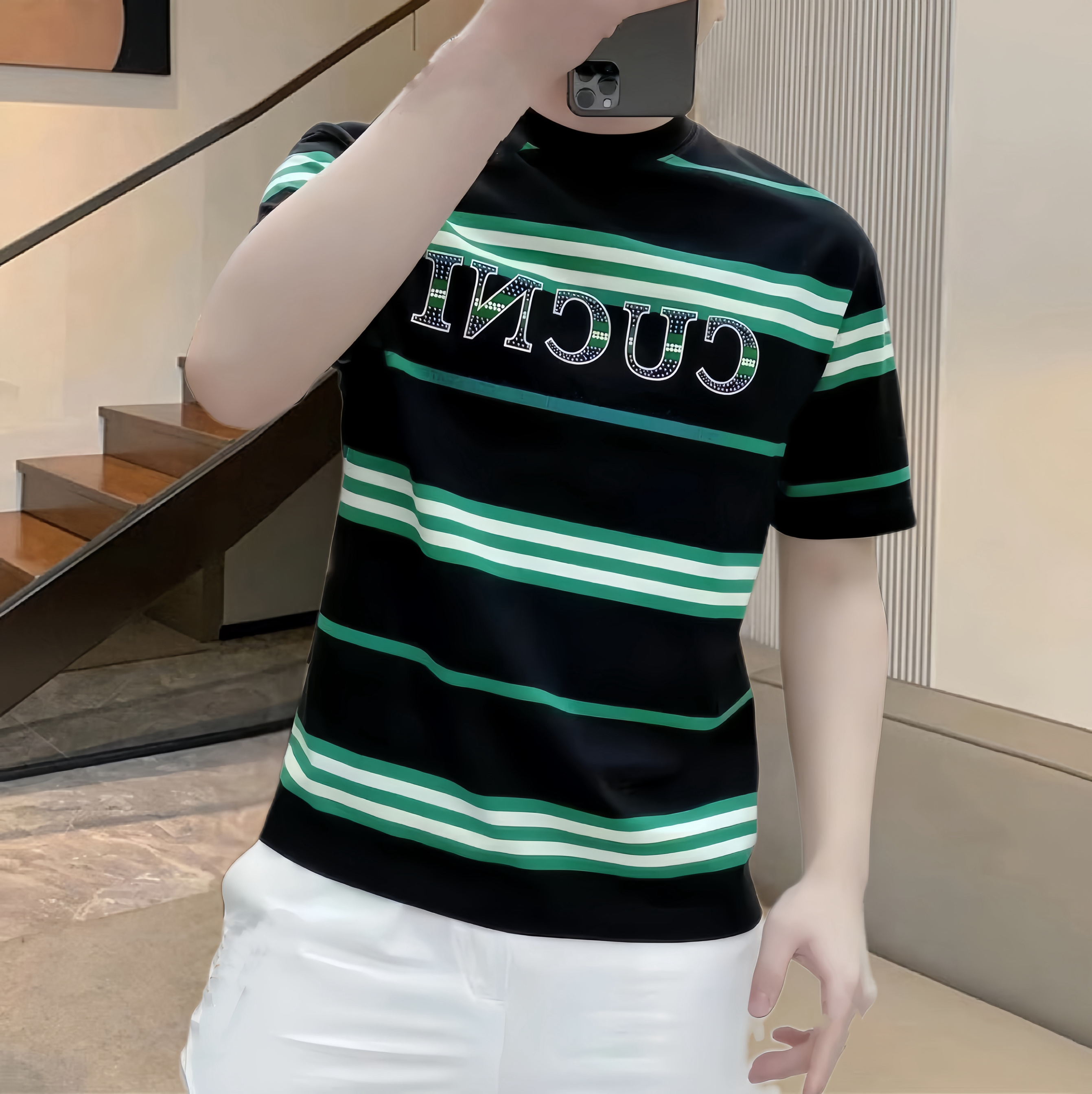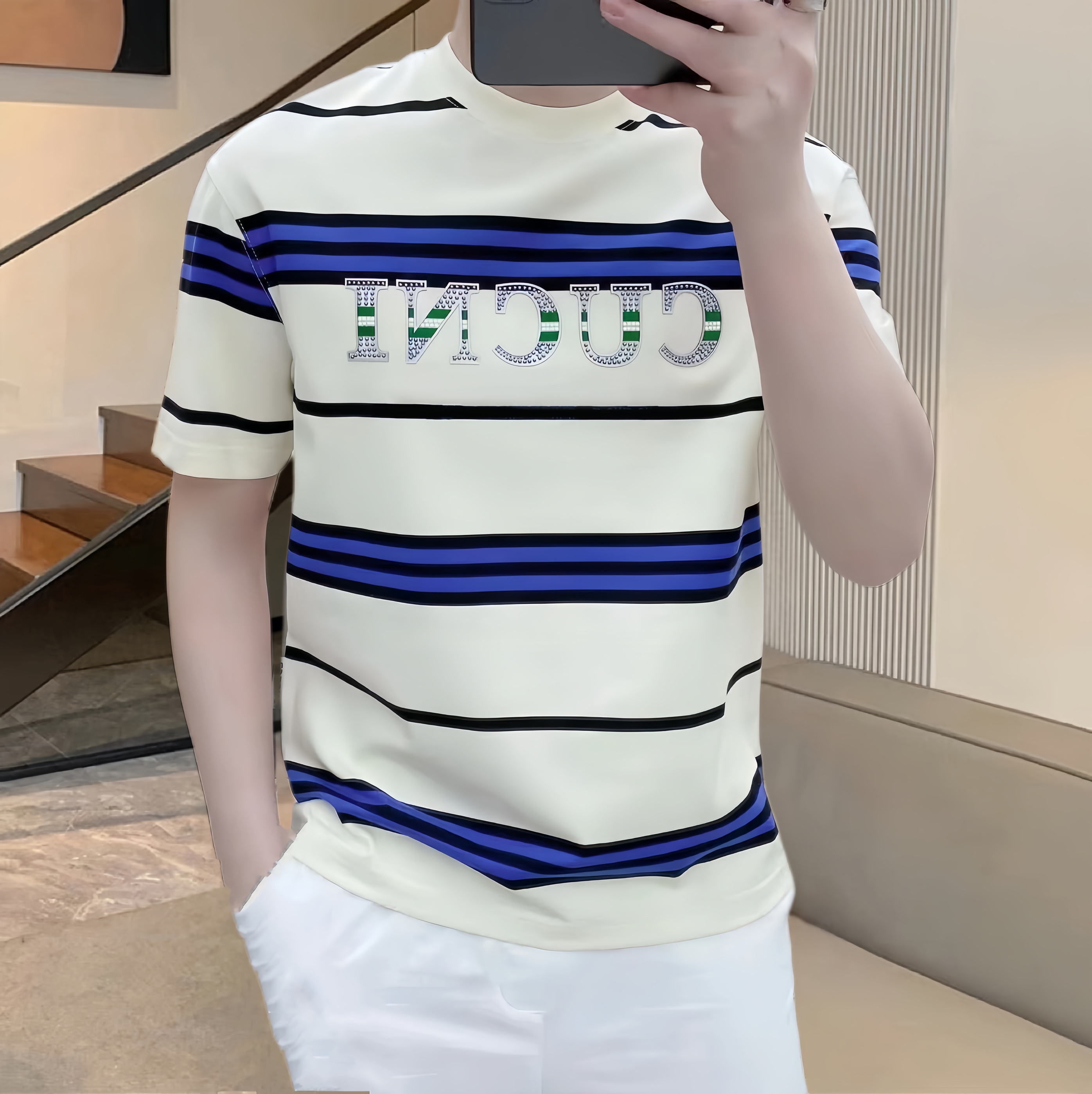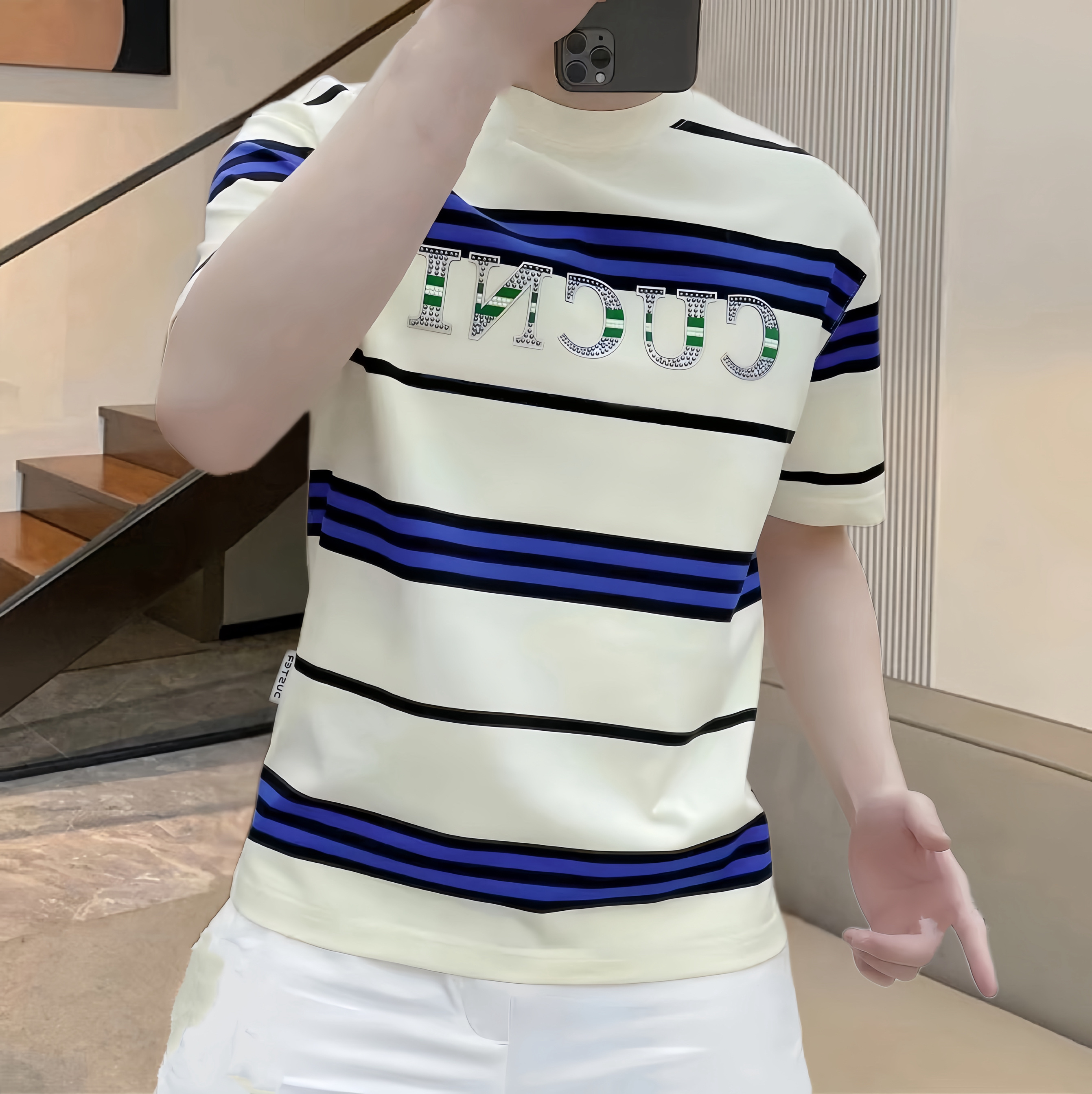 欧洲站夏季新品男士圆领t恤高品质印花条纹男装半袖体恤衫上衣潮
