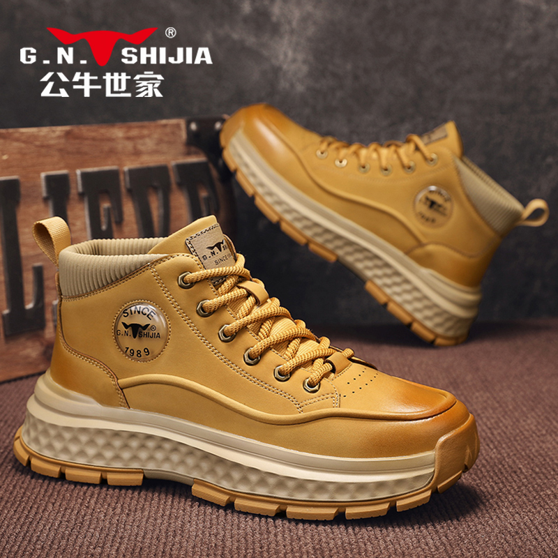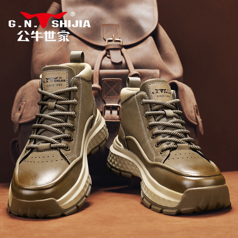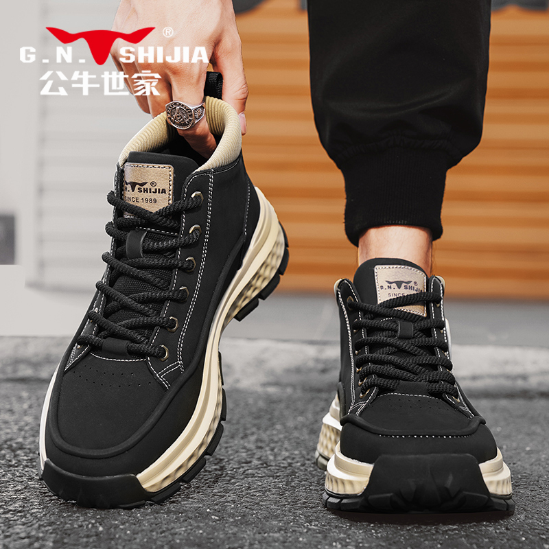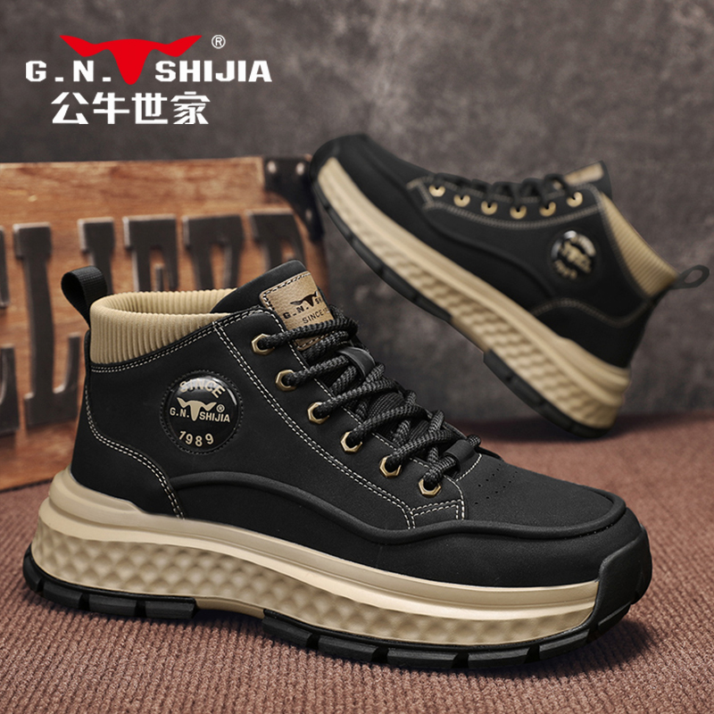 公牛世家高帮鞋男秋季户外真皮休闲运动潮鞋男士耐磨厚底中帮板鞋