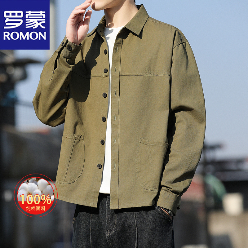 罗蒙春秋季新款100%纯棉男士外套休闲工装百搭衬衫纯色翻领外套男