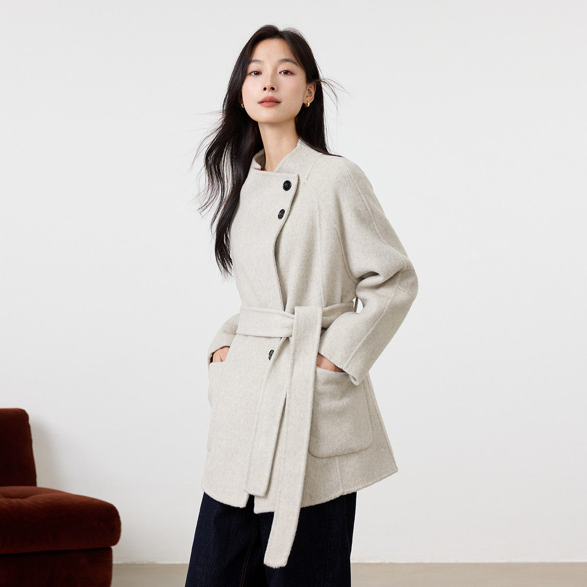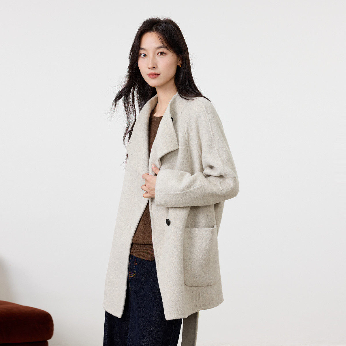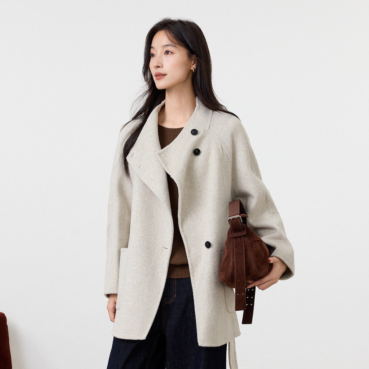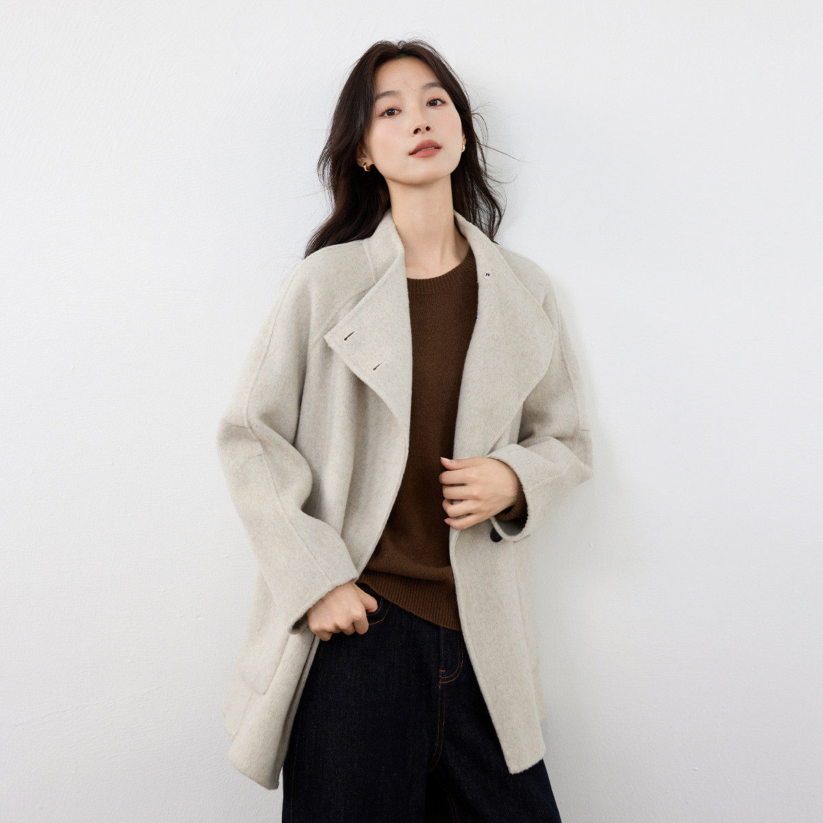 茵曼2025冬季新款绵羊毛短款双面毛呢外套女羊绒大衣休闲时尚翻领
