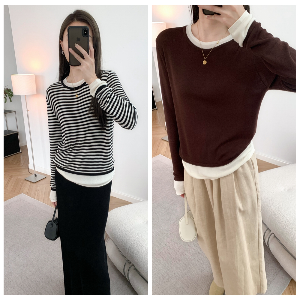宝藏假两件/早春莱赛尔长袖针织衫薄款套头上衣女装休闲慵懒CHIC