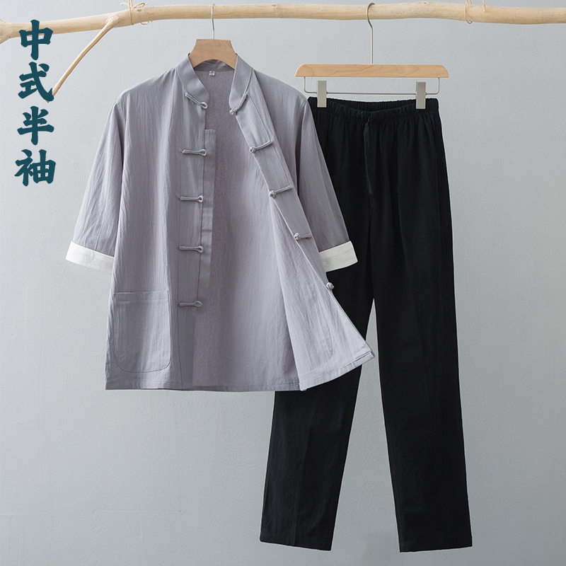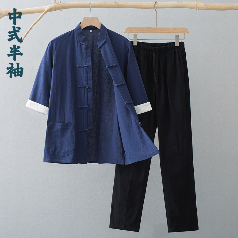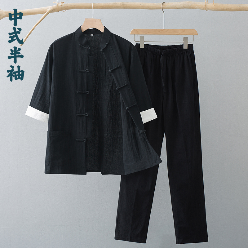 唐装男夏季薄款短袖中袖套装中国风男装中式复古盘扣纯棉汉服茶服