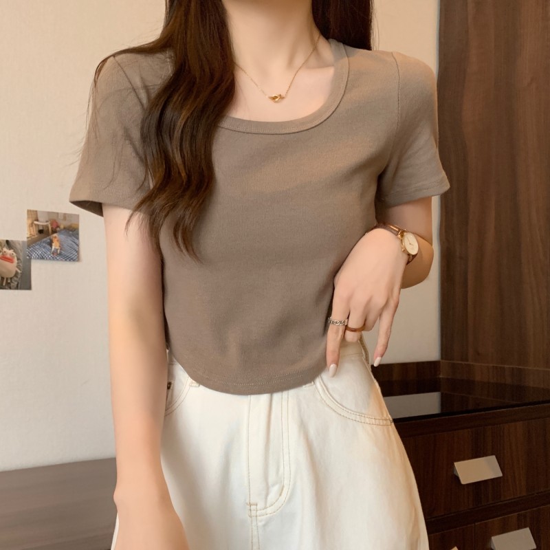 法式方领正肩显瘦白色短袖女夏季纯欲甜辣不规则下摆t恤内搭上衣