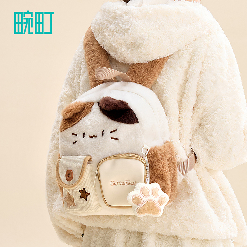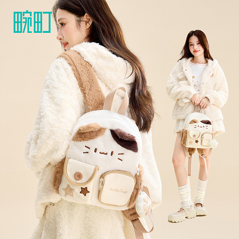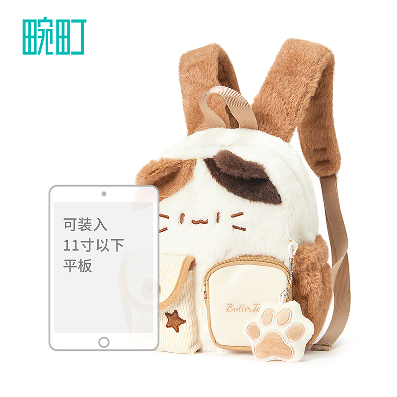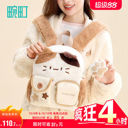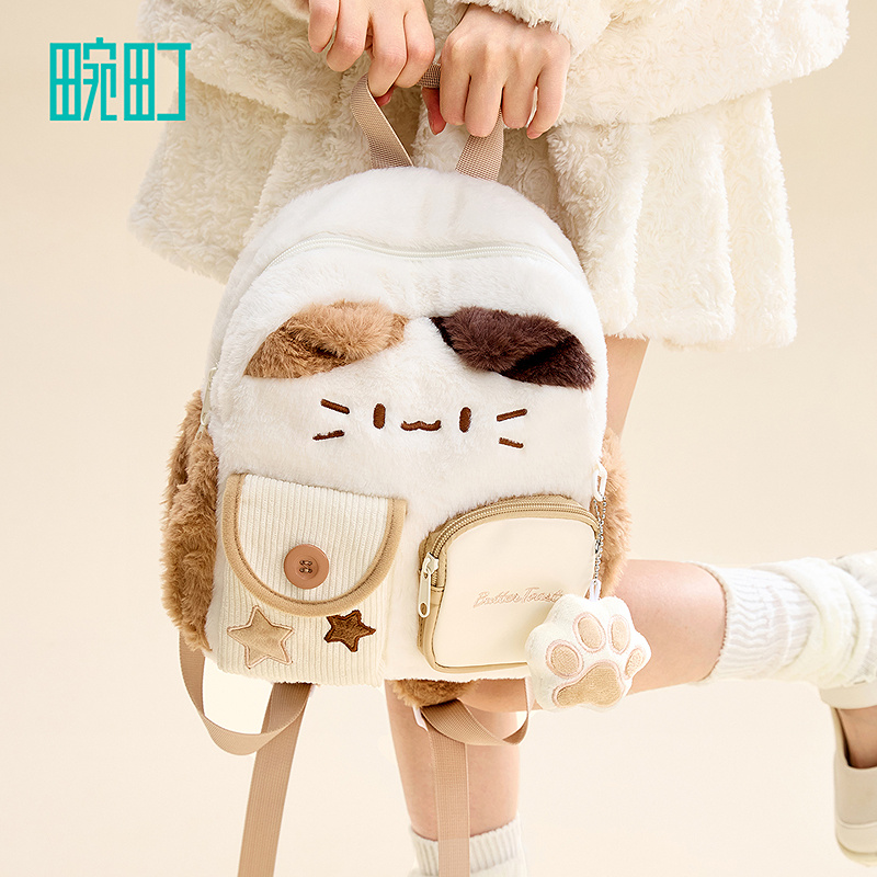 畹町三花猫可爱毛绒包女学生上课书包秋冬季少女卡通中号双肩背包