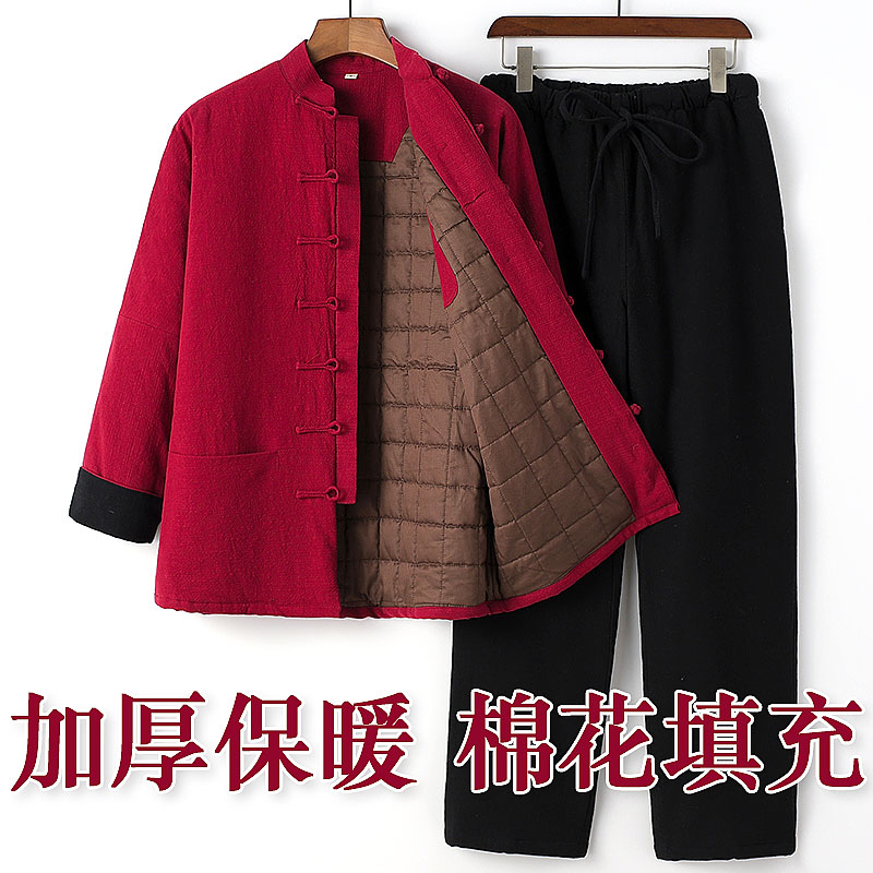 中国风连肩袖唐装男中老年棉衣棉花套装爸爸冬季棉服冬装加厚棉袄
