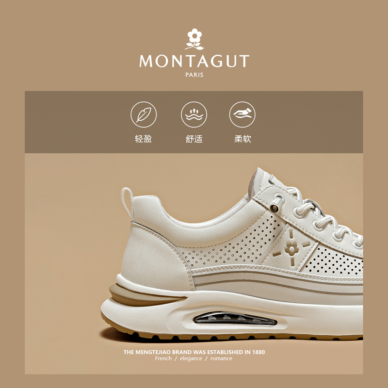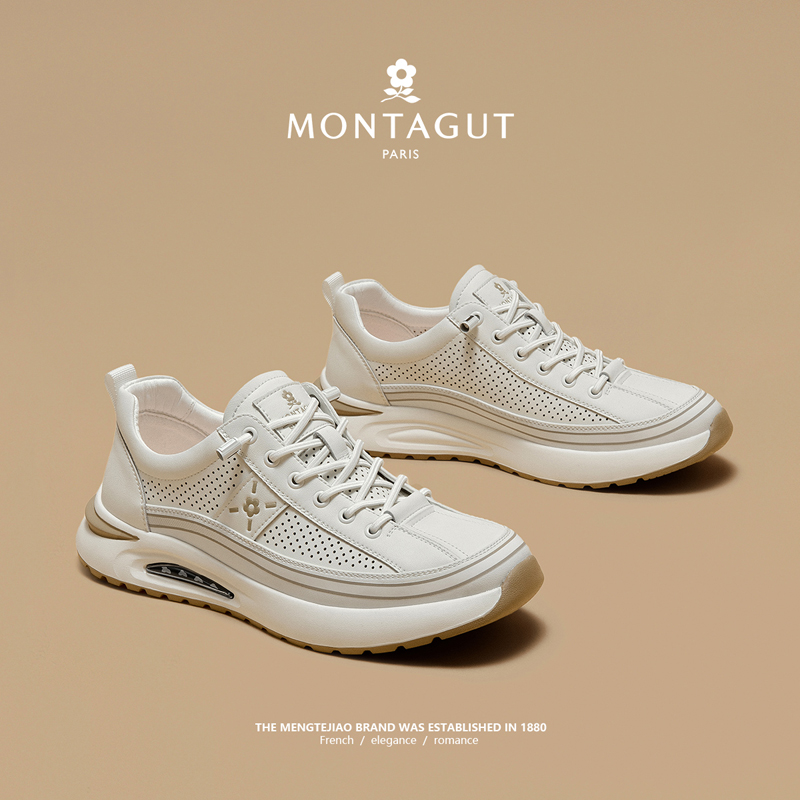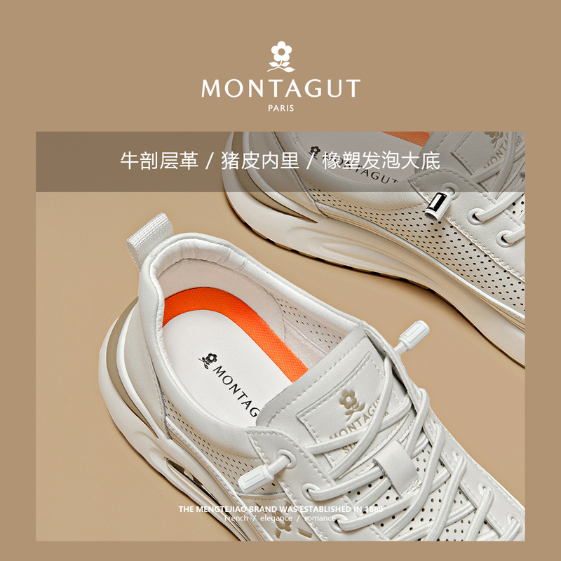 Montagut/梦特娇真皮户外休闲运动男鞋 秋季透气镂空时尚气垫板鞋