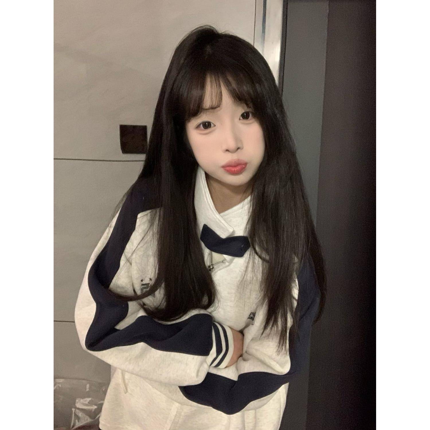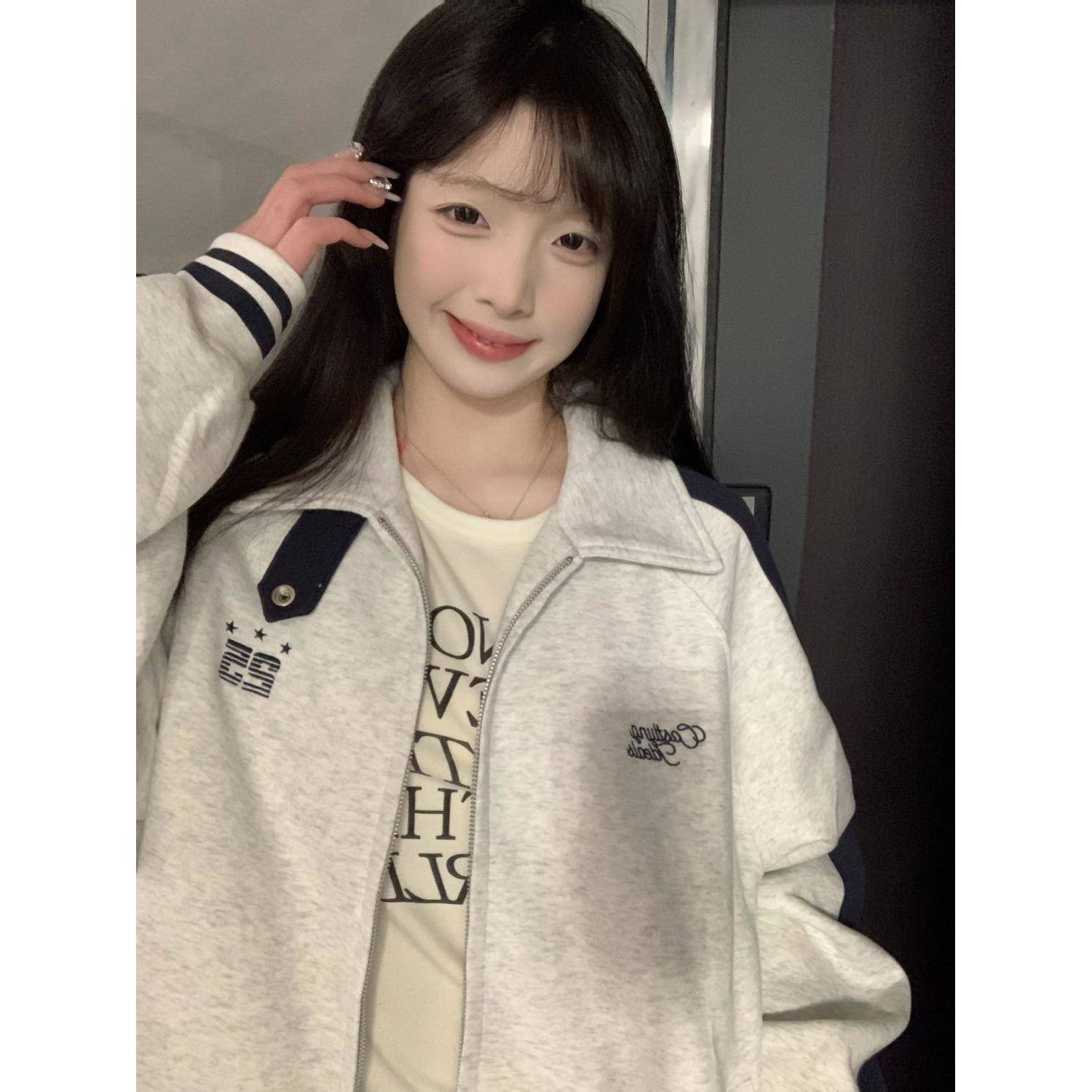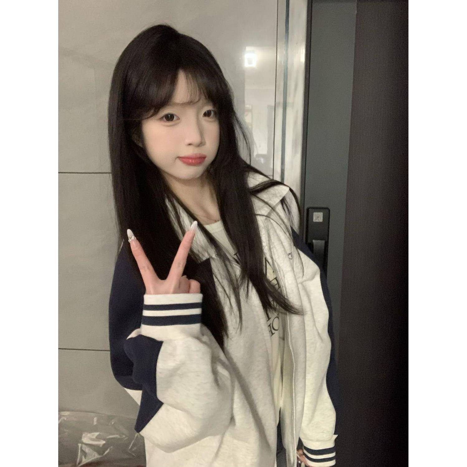 美式高街撞色拼接立领开衫卫衣外套女春秋学院风宽松情侣夹克上衣