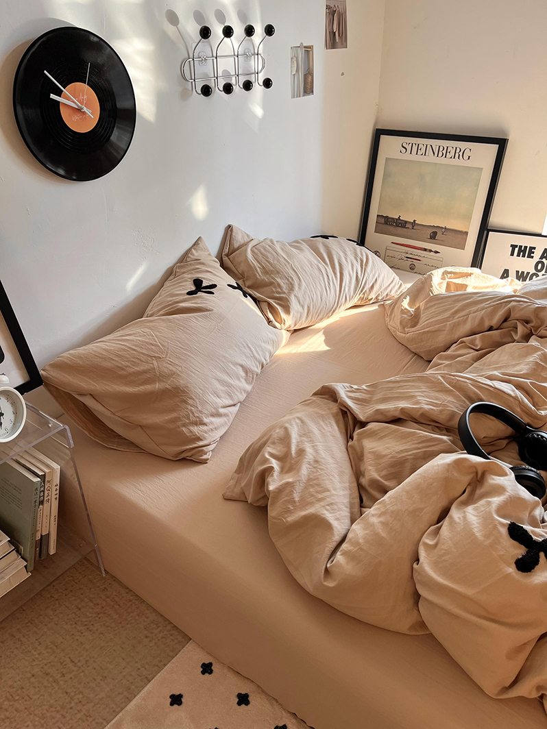 简约高级美拉德风蝴蝶结毛巾绣水洗棉四件套柔软褶皱感全棉三件套