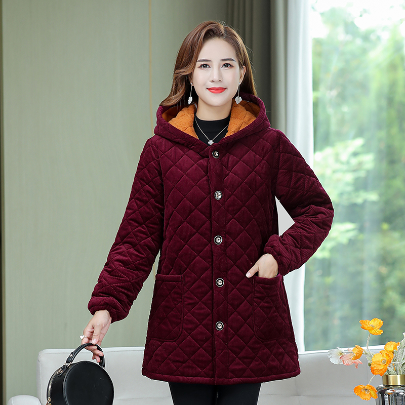 冬季女装棉袄加厚加绒夹棉保暖罩衣中长款灯芯绒棉服加肥加大外套