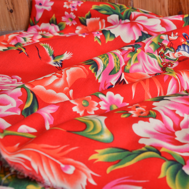 中国风牡丹面料怀旧古典东北大花布纯棉斜纹印花棉布红色天女散花