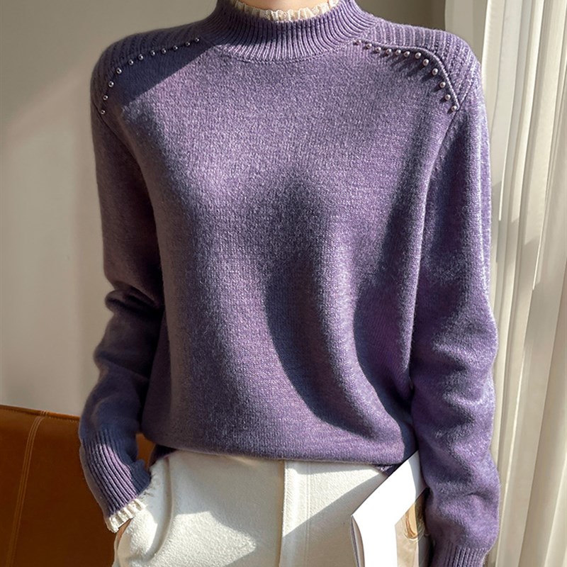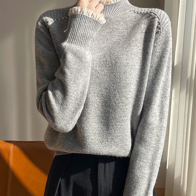 25秋季新款半高领针织衫女洋气蕾丝边设计纯色毛衣宽松内搭打底衫