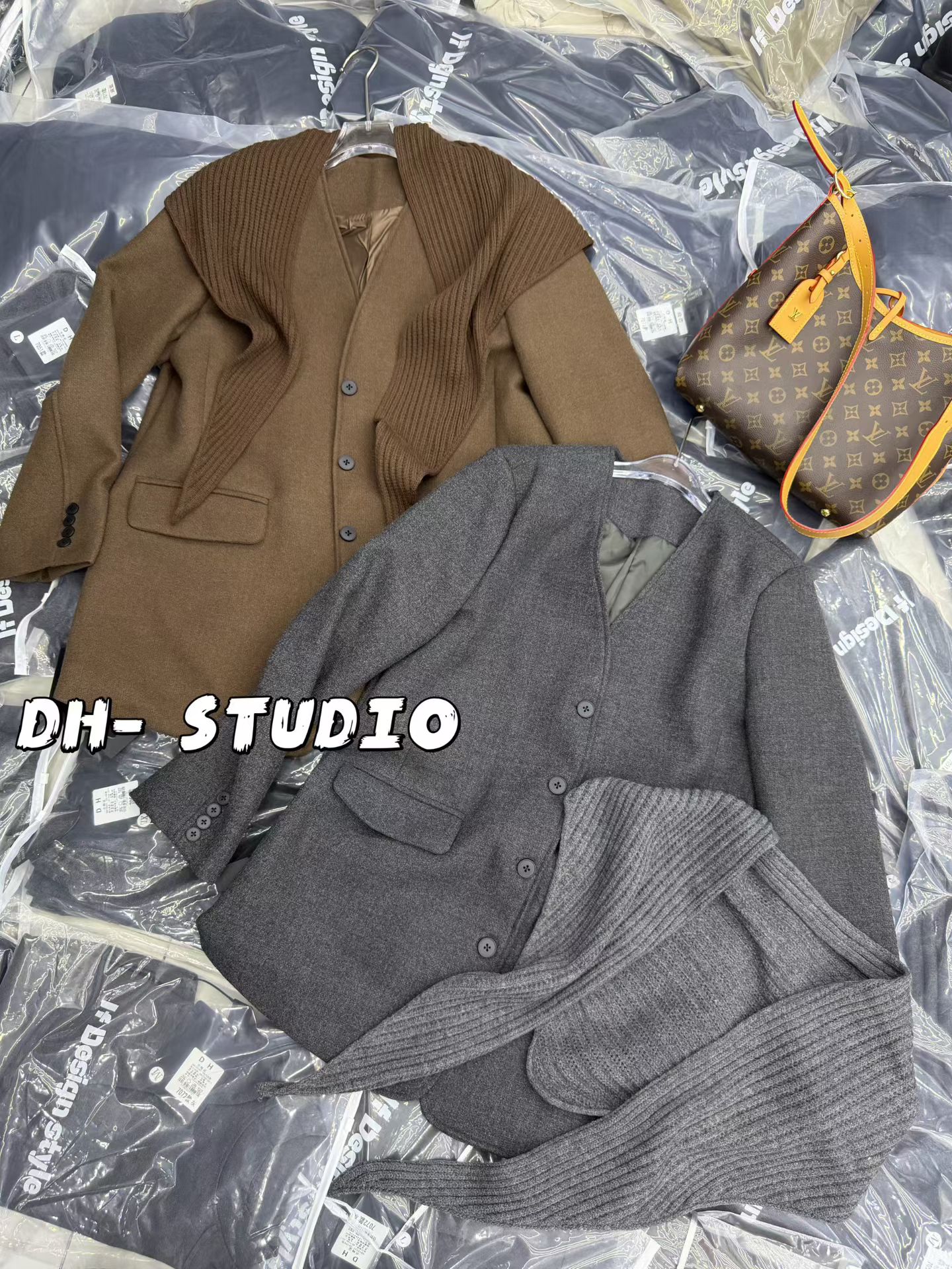 DH秋冬新款时尚百搭V领宽松长袖毛呢外套女潮大衣女ins纯色简约