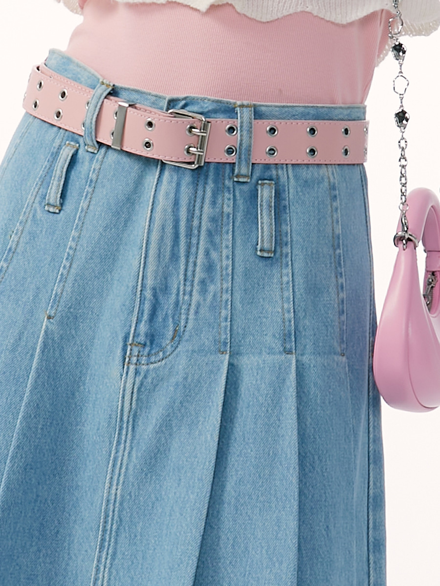 ziziFei春夏美式复古高腰显瘦设计感长裙中长款百褶牛仔半身裙女