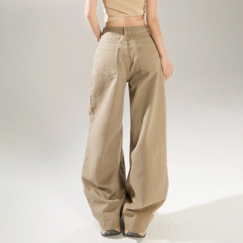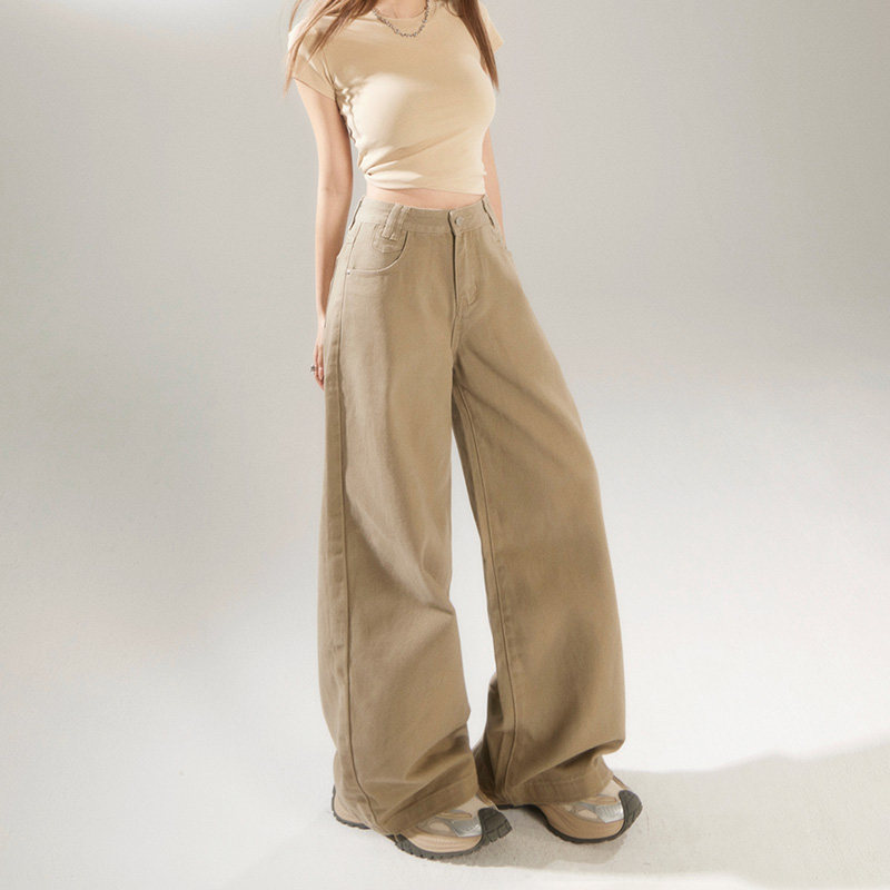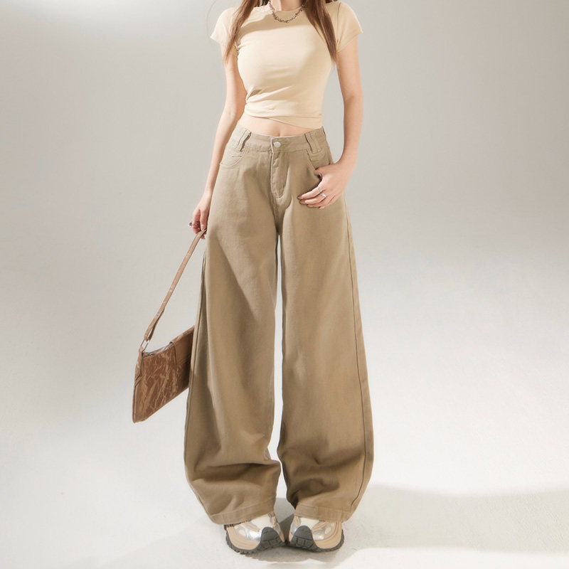RJVO卡其色垂感牛仔裤女秋季新款宽松高腰拖地阔腿裤时尚直筒长裤