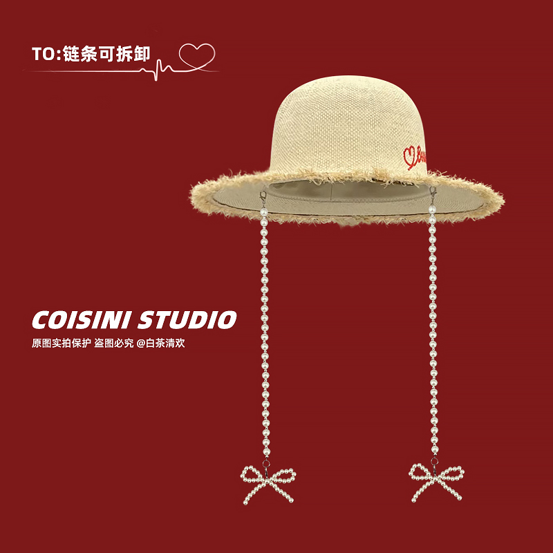 珍珠链条拉菲草毛边草帽女
