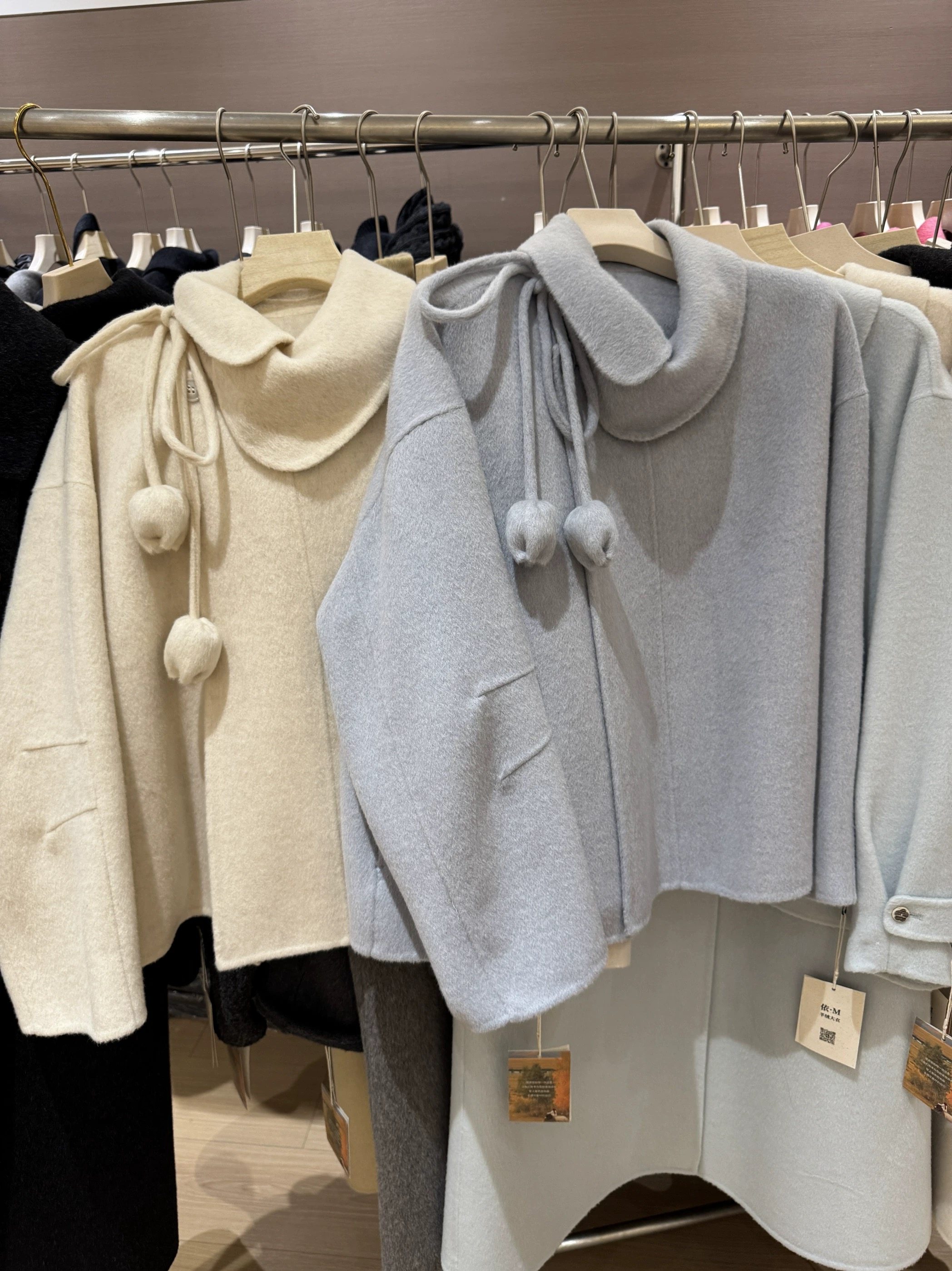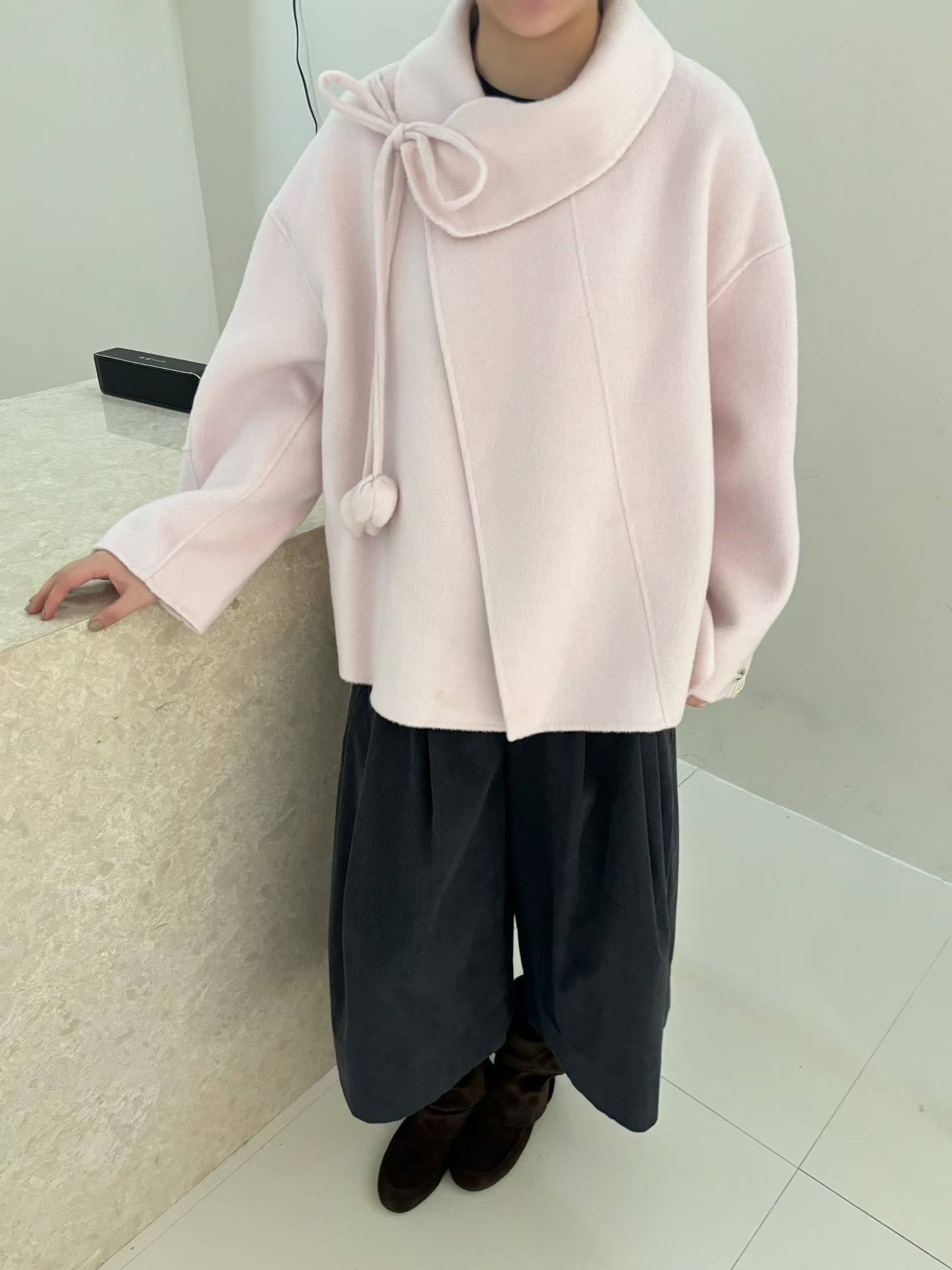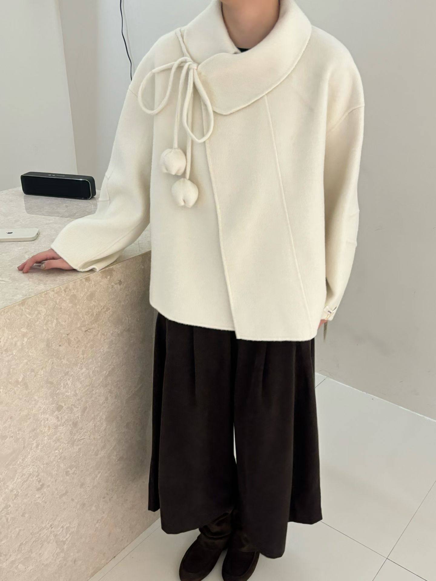 郁金香系带翻领双面羊毛呢大衣女2025冬季韩版宽松显瘦中长款外套