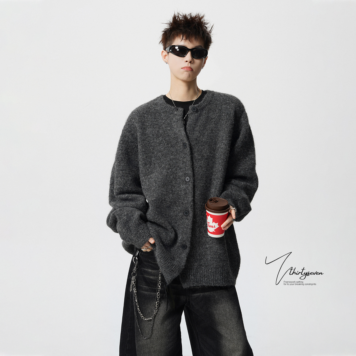 V37美式慵懒风chic纽扣开衫毛衣男款秋季潮牌复古纯色针织衫外套