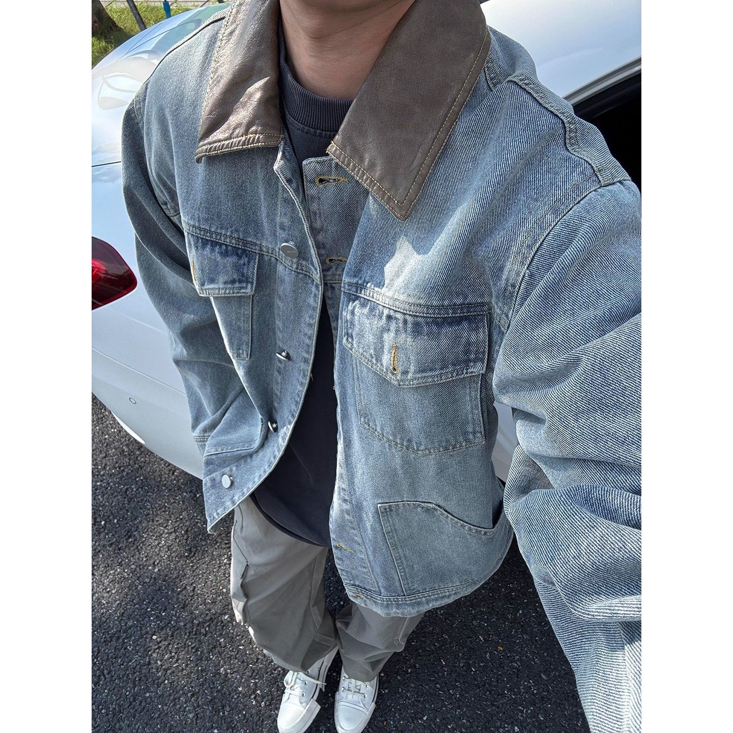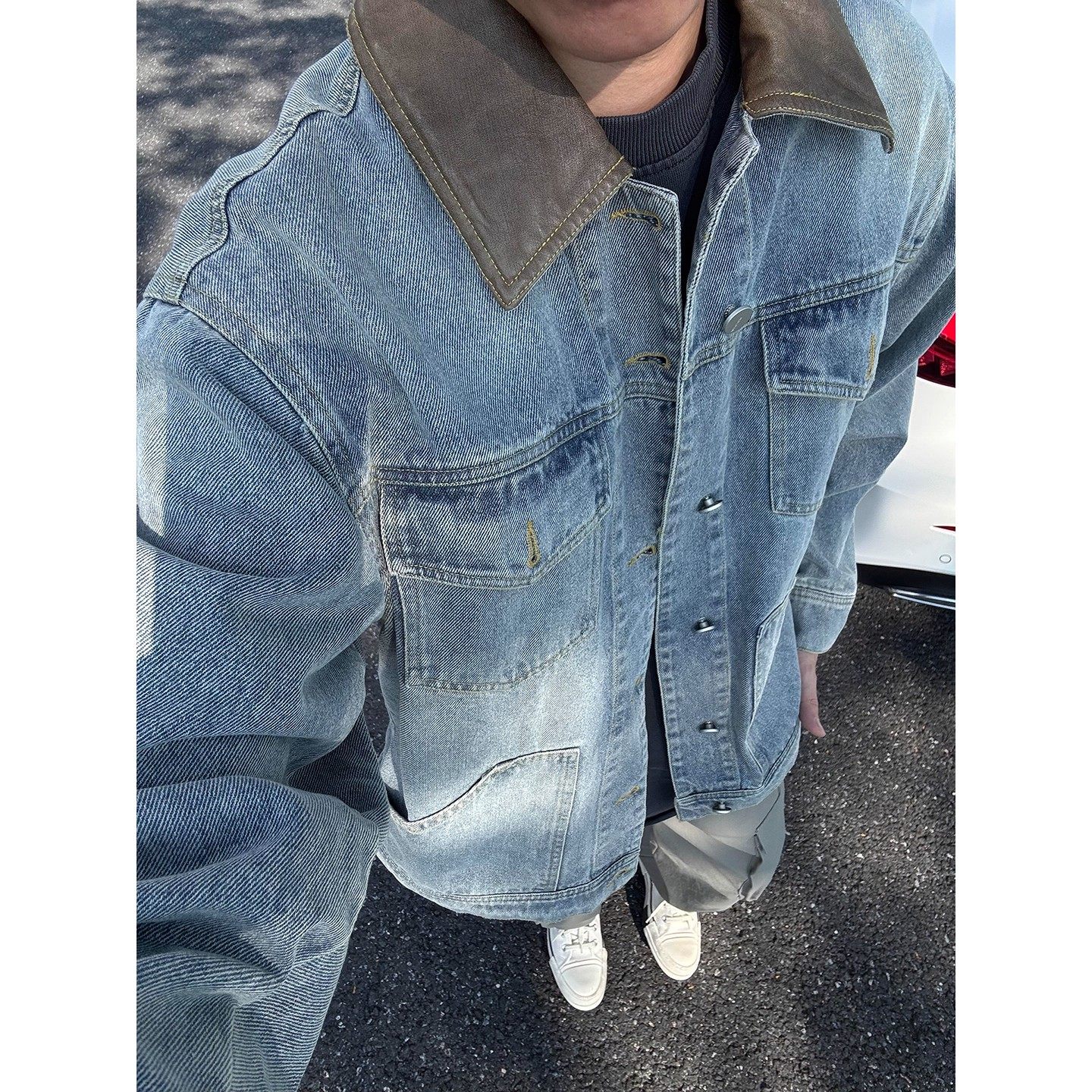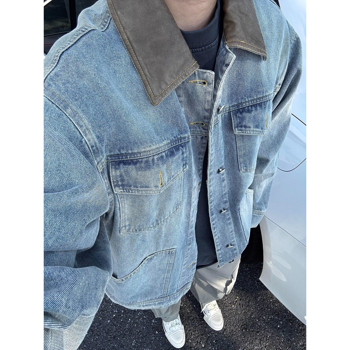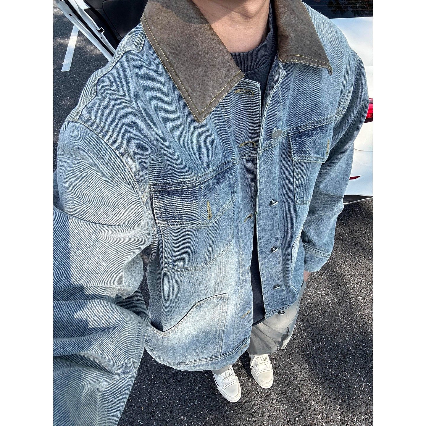美式复古拼接翻领牛仔夹克男潮牌oversize底特律外套水洗做旧上衣