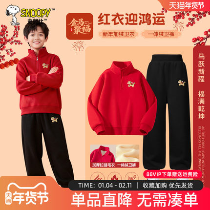 史努比儿童喜庆过年衣服2026新款冬装男孩红色加绒套装男童拜年服