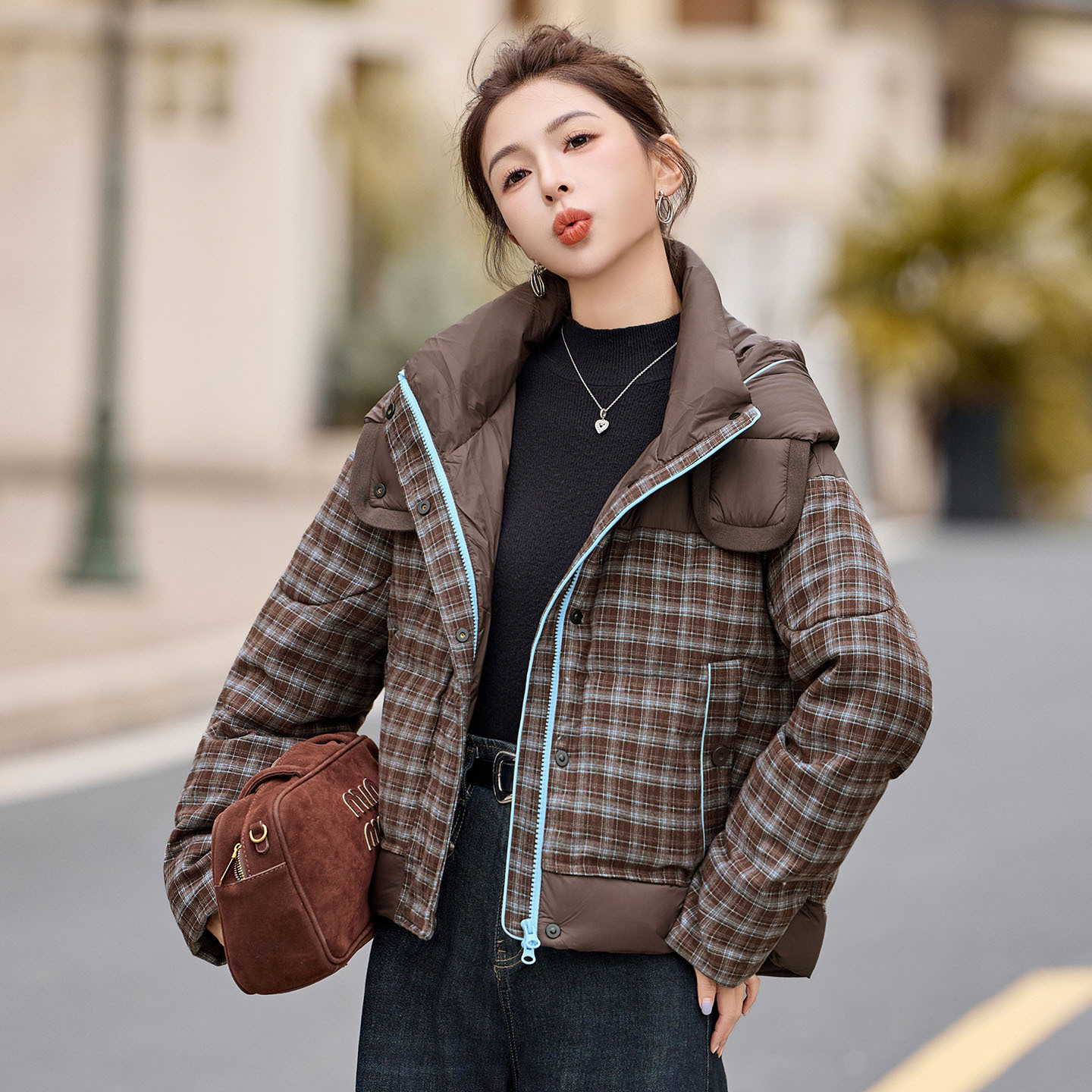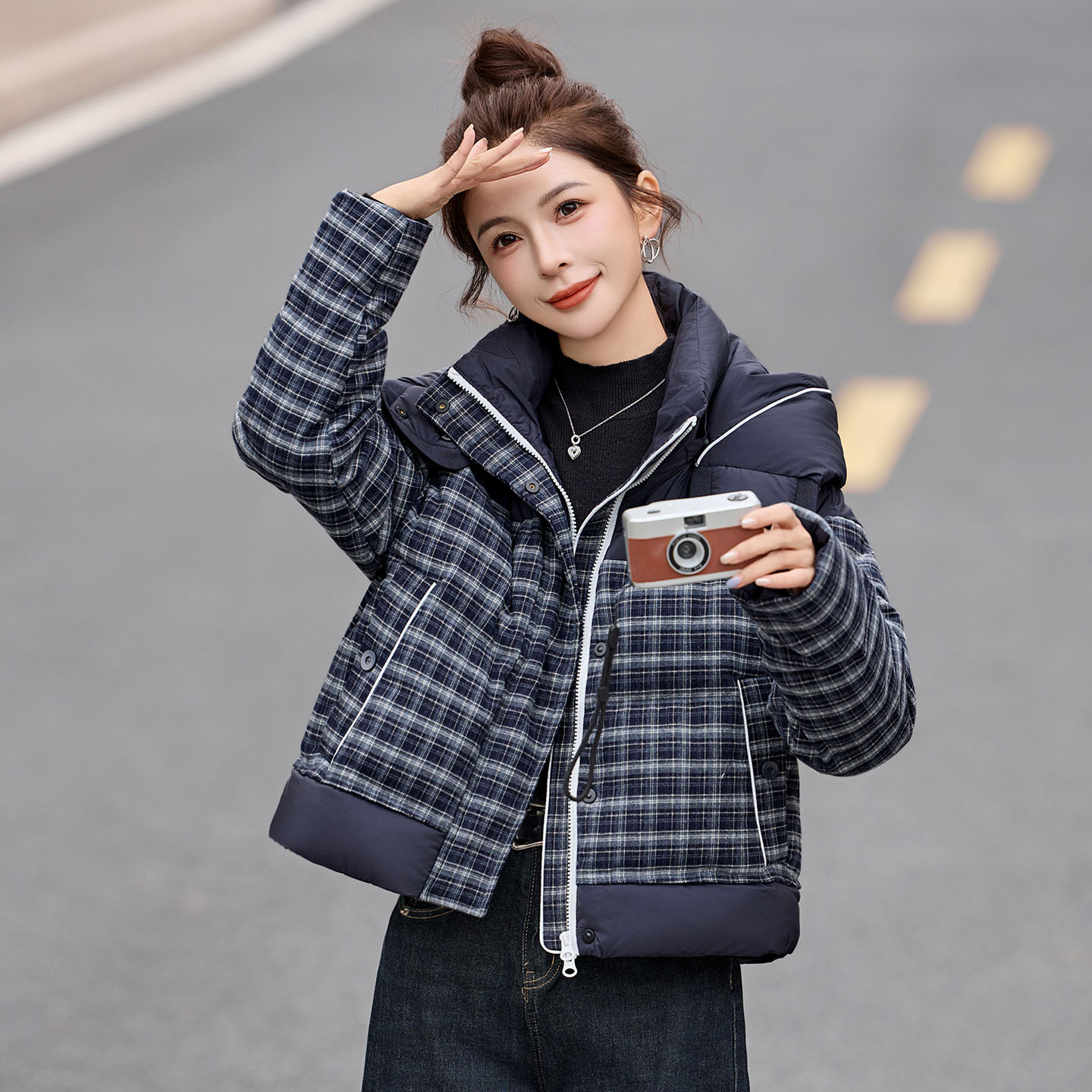 时尚拼接格子连帽羽绒服女2025冬季新款小个子宽松加厚外套短款