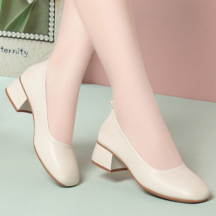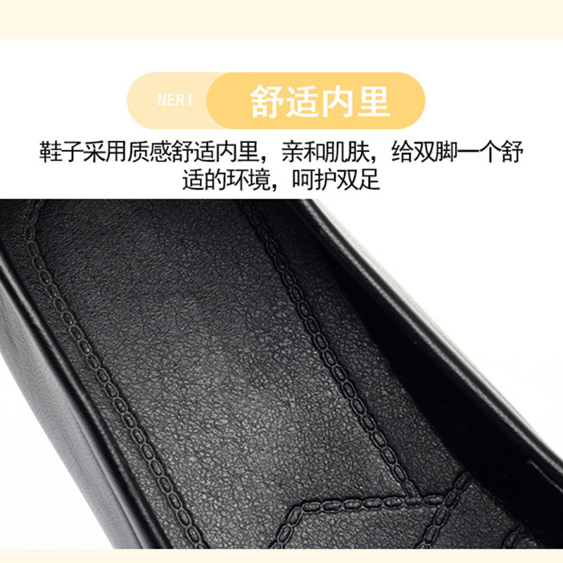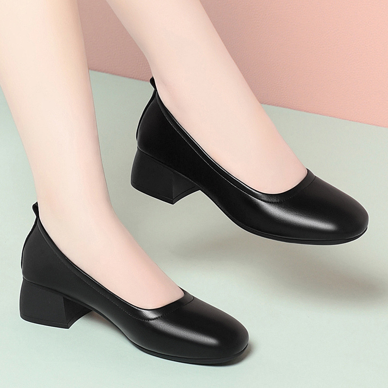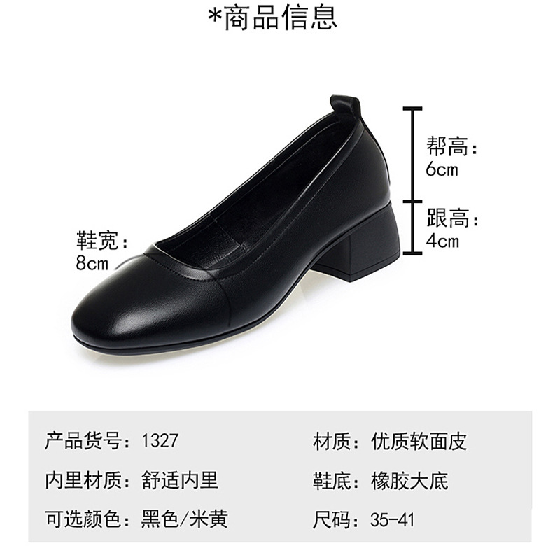 职业高跟黑色粗跟面试百搭时尚浅口方头软皮舒适一脚蹬不累脚单鞋