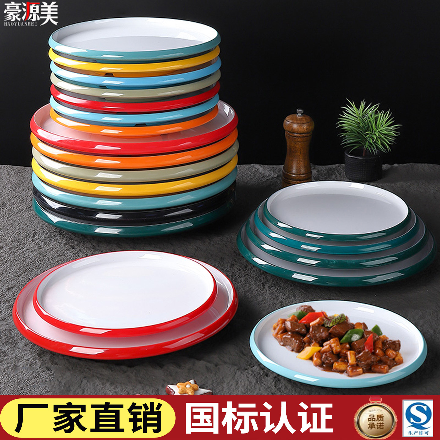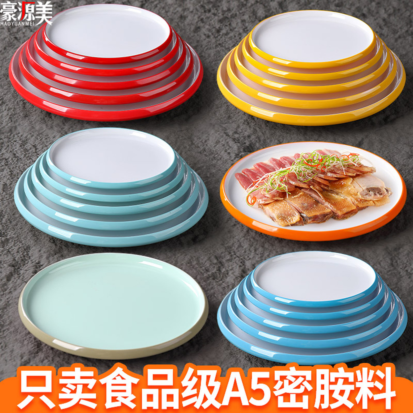密胺圆形烧烤盘子自助餐火锅菜盘平盘盖饭盘商用饭店专用炒菜盘子